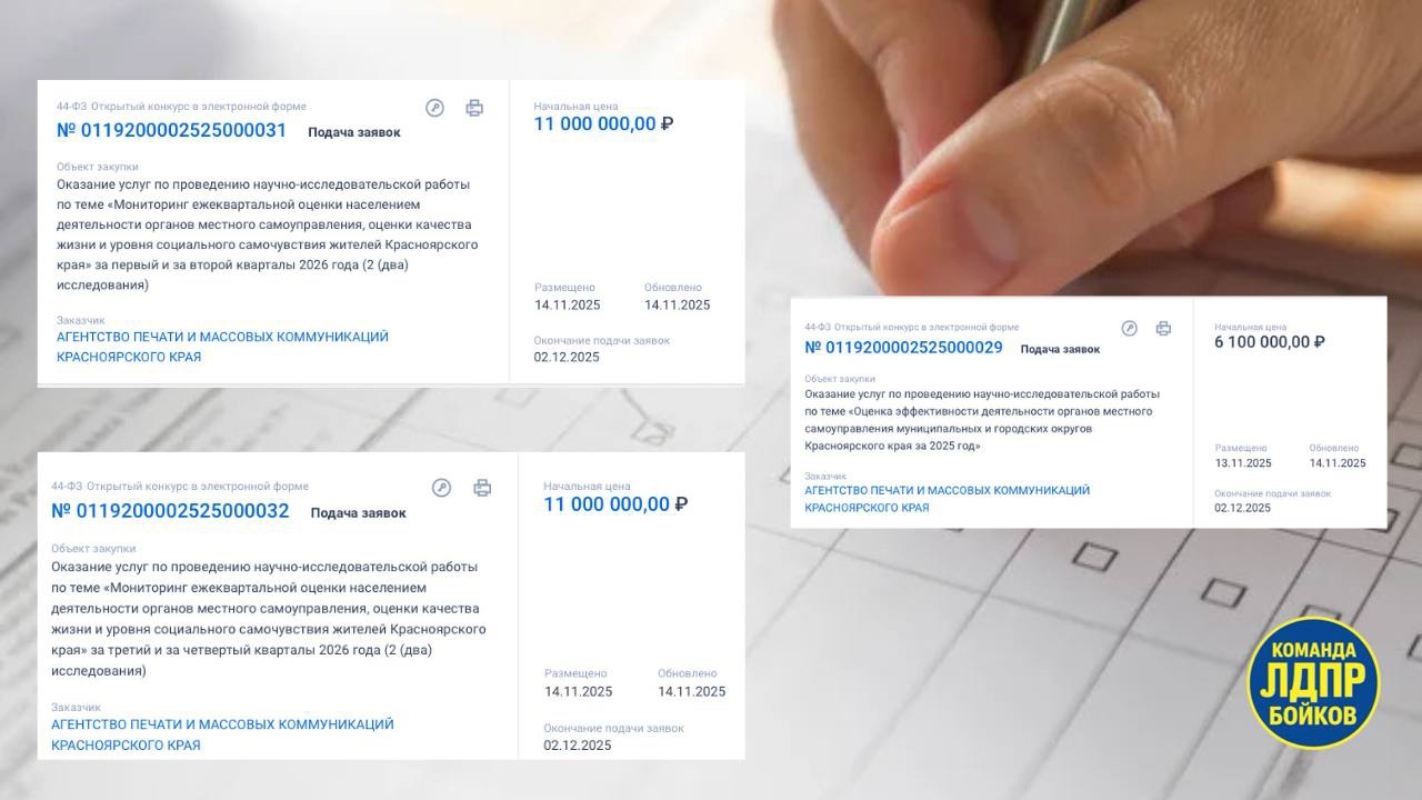 На портале госзакупок руководитель фракции ЛДПР в Заксобрании края Алексей Бойков обнаружил два лота на проведение научно-исследовательской работы по мониторингу оценки населением работы органов местного самоуправления и губернатора Красноярского края. Начальная суммарная стоимость обоих лотов — 22 миллиона рублей. Судя по информации с сайта госзакупок, такое исследование край заказывает впервые
