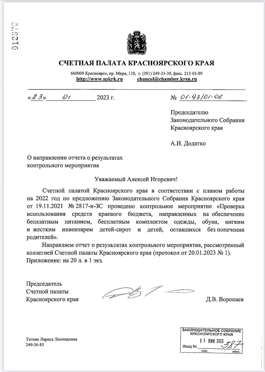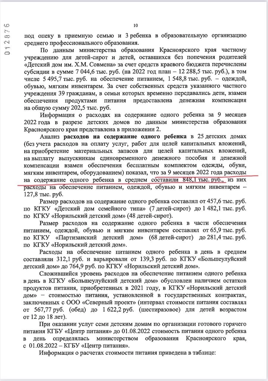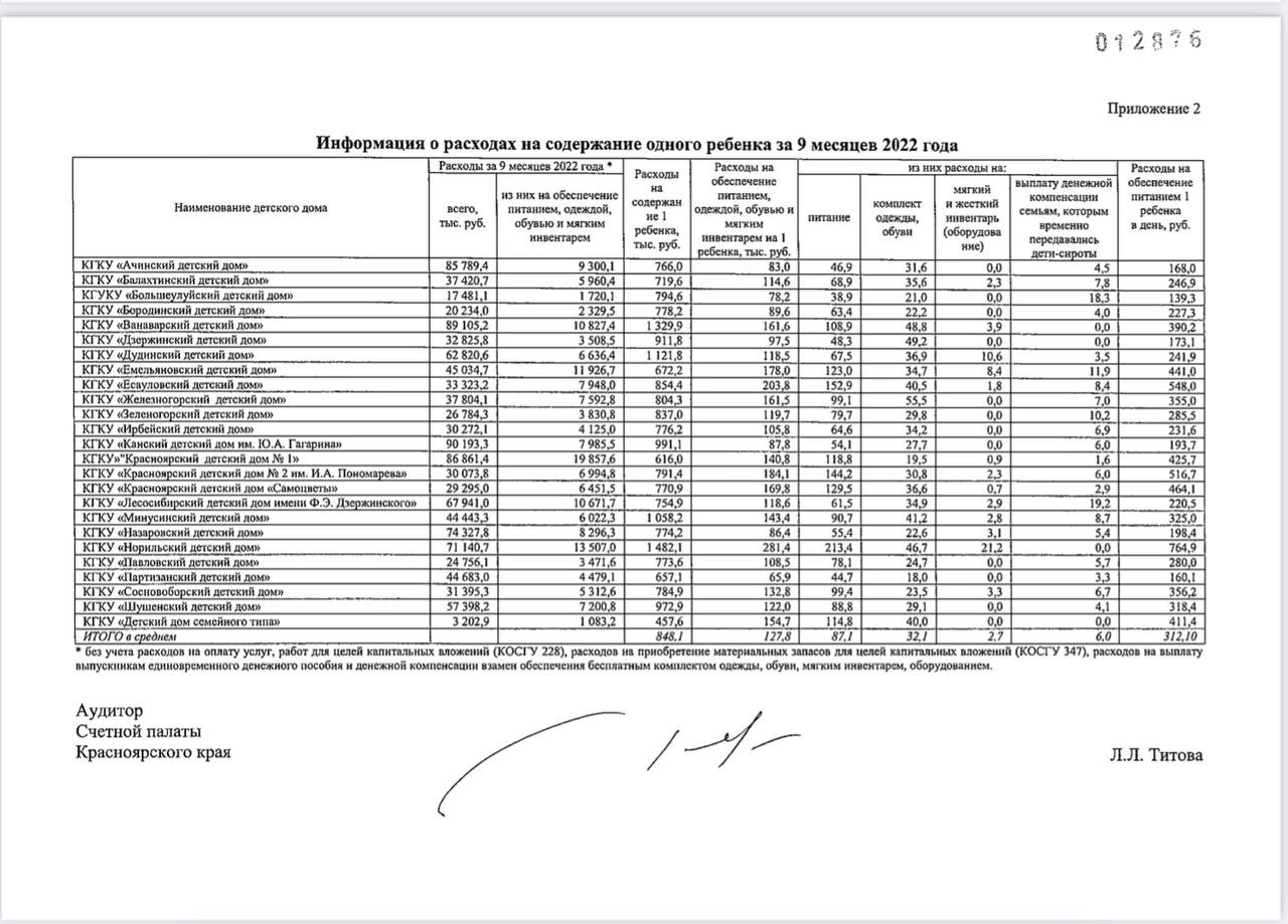 «Если внимательно прочитать заключение счетной палаты, становится понятно, с чего вдруг вдруг вся ювенальная система рассвирепела. Планы чиновников по набору в детские дома не выполняются. Большие деньги не получены и не освоены. Средняя сумма расходов на одного ребёнка в детдоме на территории Красноярского края за 9 месяцев - 848 тысяч. А это в среднем 1,131 миллиона на каждого ребёнка в год. И плюс схематозы с трусами и конфетами», — комментирует итоги контрольного мероприятия парламентарий.