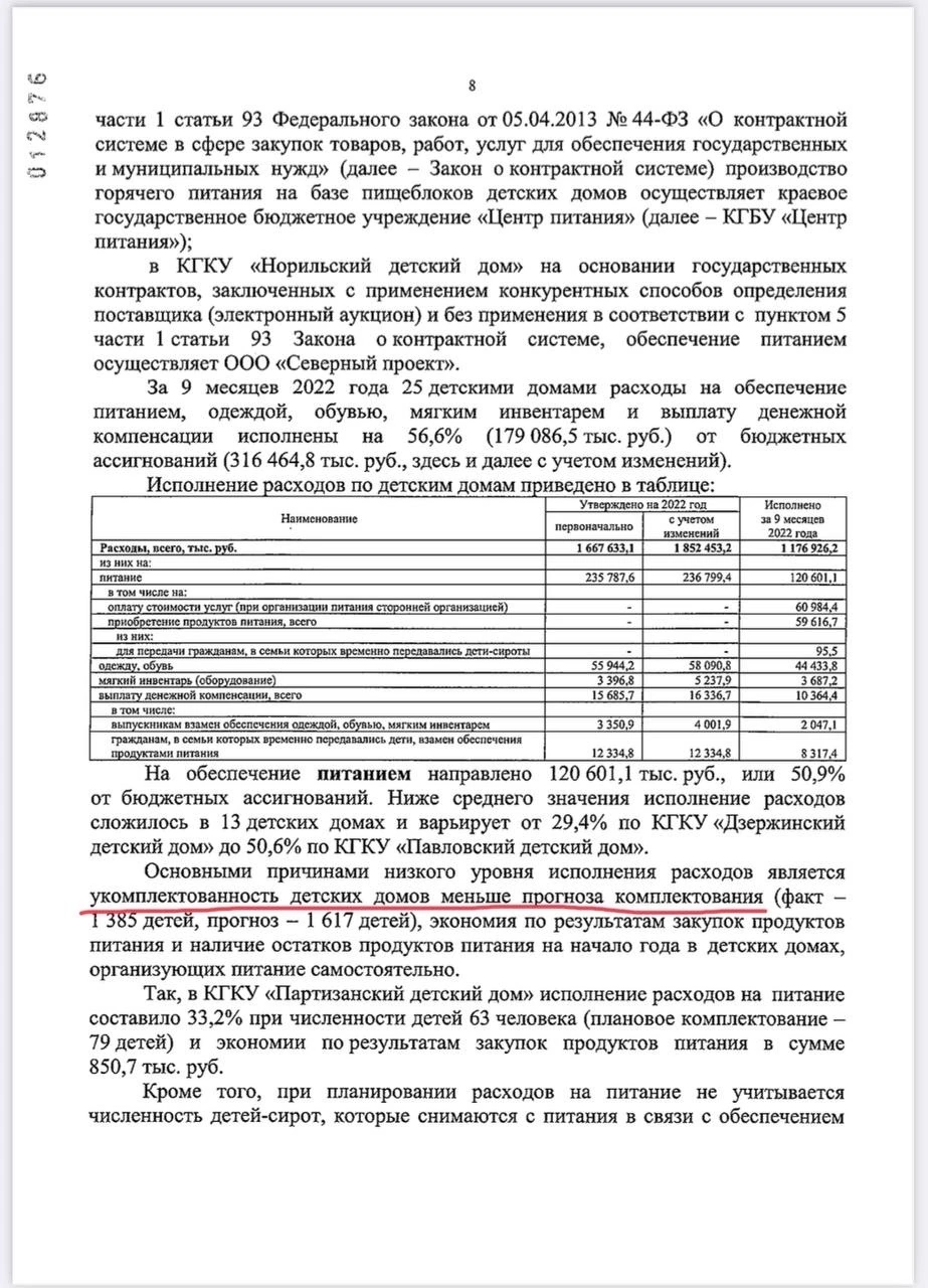 В отчете контрольно-счетной палаты говорится о низком уровне исполнения расходов, его связывают с недобором детей. Укомплектованность детских домов меньше прогноза комплектования: фактически - 1385 детей, прогноз - 1 617 детей. Также указаны расходы на содержание одного ребенка, суммы довольно приличные.