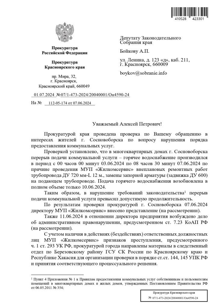 По результатам проверки прокуратура Сосновоборска внесла представление директору МУП «Жилкомсервис» и возбудила дело об административном правонарушении, предусмотренном ст. 7.23 КоАП РФ.