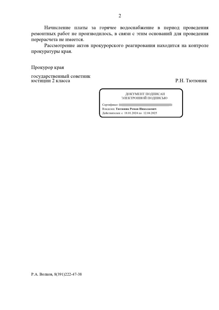 С учетом наличия в действиях/бездействии ответственных должностных лиц МУП «Жилкомсервис» признаков преступления, предусмотренного ч. 1 ст. 293 УК РФ, прокуратура направила материалы в следственный отдел СК России по Красноярскому краю и Республике Хакасия для организации проверки и принятия соответствующего процессуального решения.