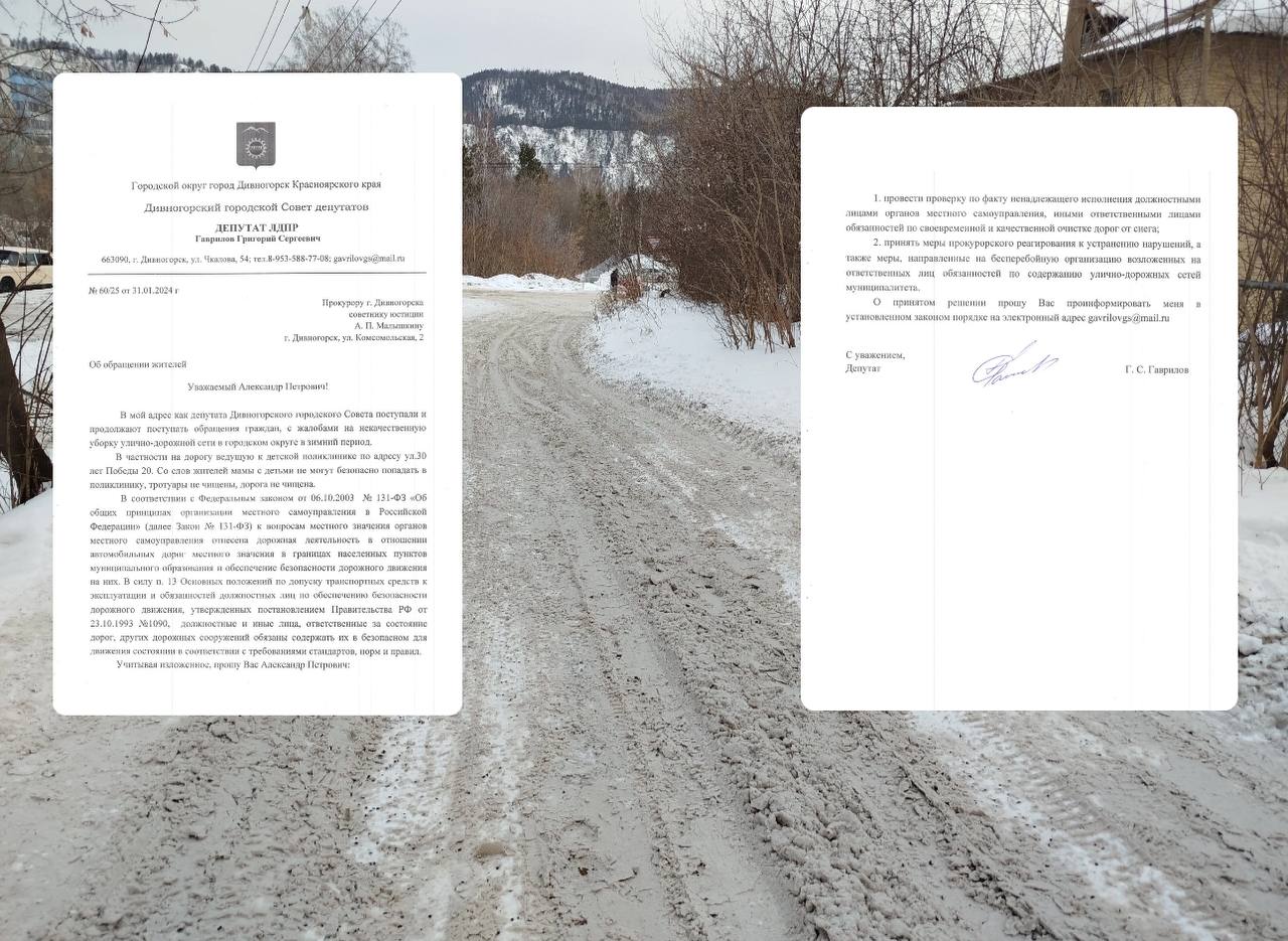 «Многое сказали о неудовлетворительной уборке улиц от снега в Дивногорске, но о дороге к детской поликлинике царит безмолвие. Каждый день мамочки с санками и колясками, с маленькими детьми на руках отправляются по этому опасному маршруту, где отсутствует хоть какой-то тротуар», — написал Григорий Гаврилов.