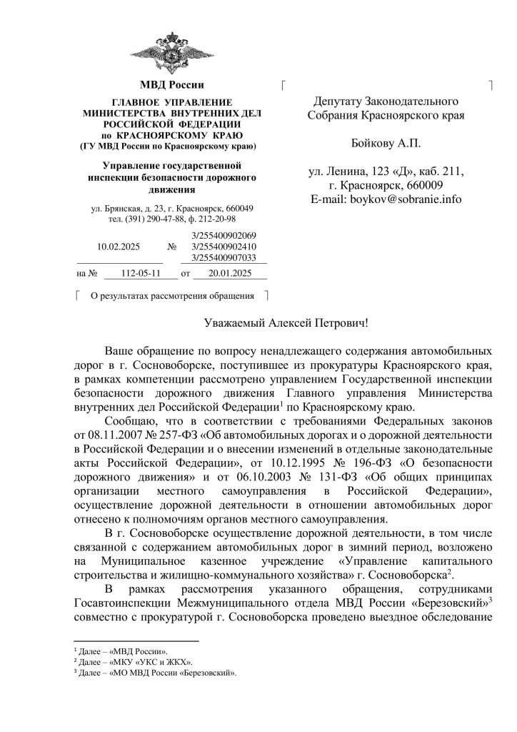 Ответ УГИБДД края подтвердил жалобы сосновоборцев. В результате проведённой проверки сотрудников полиции и прокуратуры выявлены нарушения обязательных требований в виде наличия зимней скользкости и снежных валов на отдельных участках улично-дорожной сети.