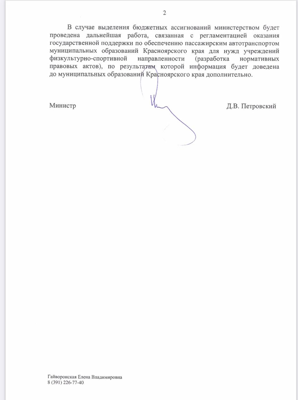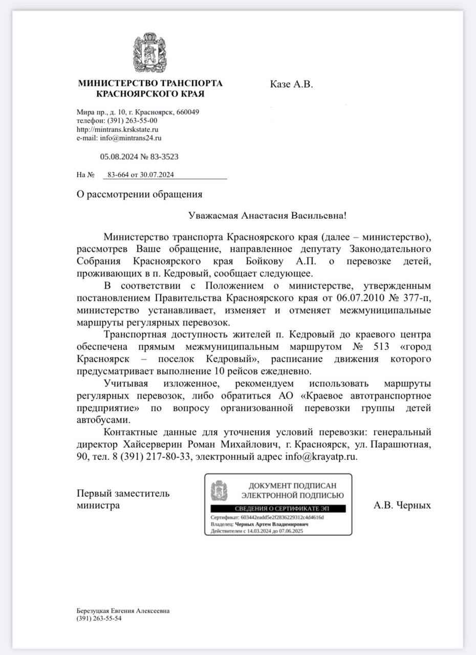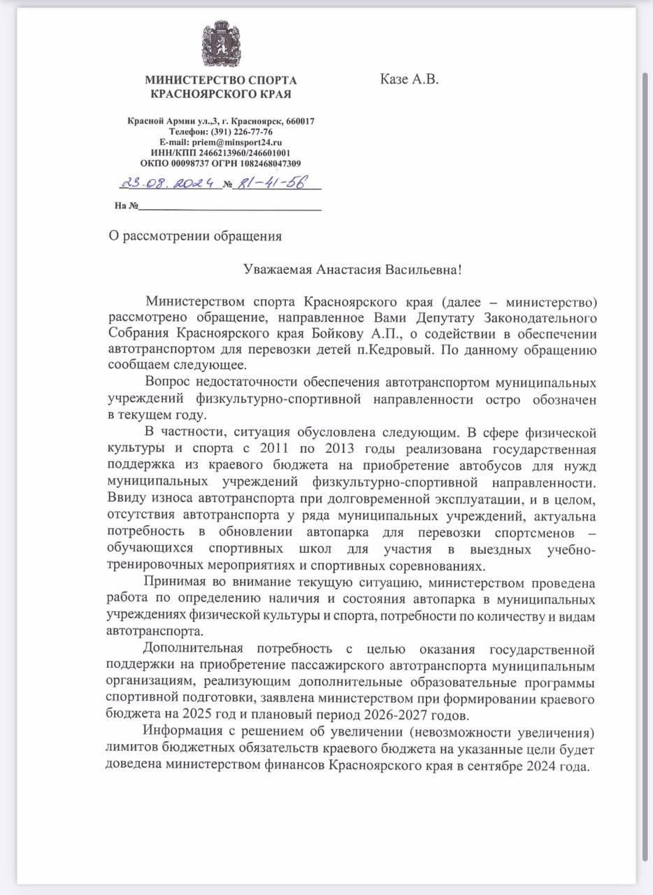 В ответе министерства спорта говорится о возможности получения автобуса для перевозки детей на соревнования и другие мероприятия посредством участия в краевых и федеральных программах. Анастасия Казе снова обратилась к Алексею Бойкову с просьбой разобраться в ситуации и оказать содействие в стимулировании местных чиновников к участию в таких программах.