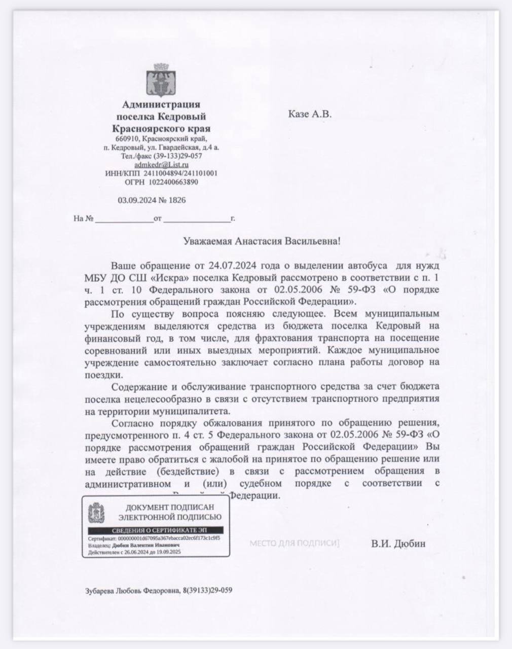 В ответе главы Кедрового сообщается, что транспортировка детей организуется, а минтранс предложил детям добираться до мест проведения соревнований рейсовыми автобусами.