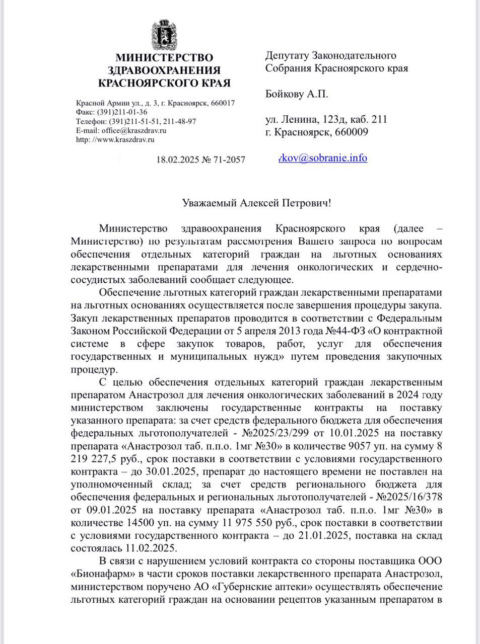 Сегодня Алексей Бойков получил официальный ответ от профильного краевого министерства. Выяснилось, что одна партия лекарств для онкобольных «Анастрозол» на склад так и не пришла, хотя, судя по срокам поставок, препараты должны были оказаться в крае еще 30 января. Вторая партия этого же лекарства пришла на склады, но с задержкой в три недели. В Минздраве объяснили, что их подвел поставщик — компания «Бионафарм».