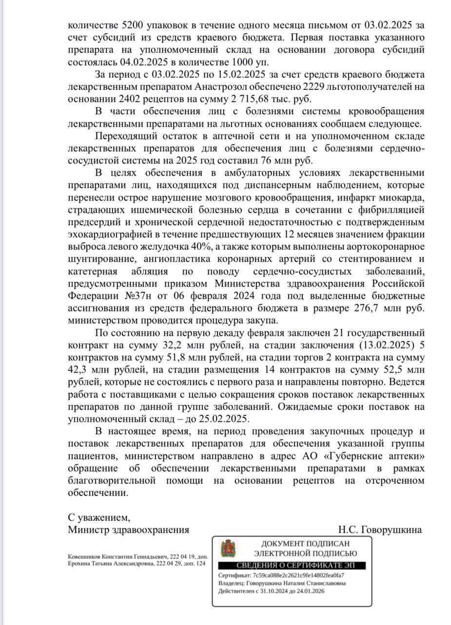 С лекарствами для лечения сердечно-сосудистых заболеваний, на перебои с которыми также жалуются люди, ситуация иная. Минздрав еще только в процессе закупки необходимых препаратов. Часть контрактов все еще на стадии заключения. По тем контрактам, что уже успели заключить, лекарства придут до 25 февраля.