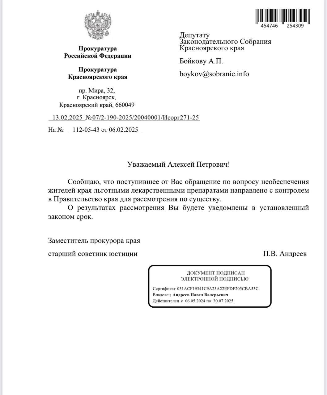 «К вопросу обеспечения льготными лекарствами жителей края уже подключилась краевая прокуратура. Ведомство направило соответствующий запрос в Правительство края для рассмотрения. Об итогах обещают уведомить в ближайшее время», — рассказал Алексей Бойков.