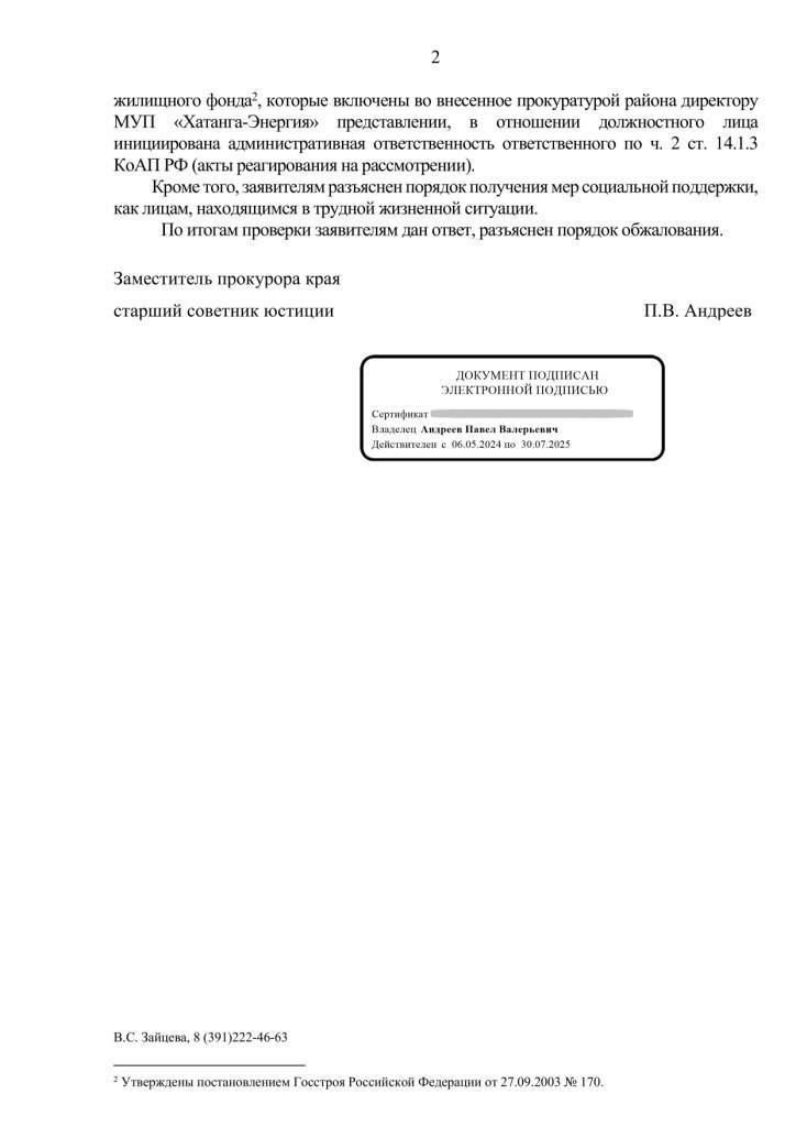 Хотя полного прекращения теплоснабжения, перемерзания тепловых сетей в многоквартирных домах и социально-значимых учреждениях не обнаружили, прокуратура подтвердила, что температурный режим в домах хатангчан не соответствовал нормам.