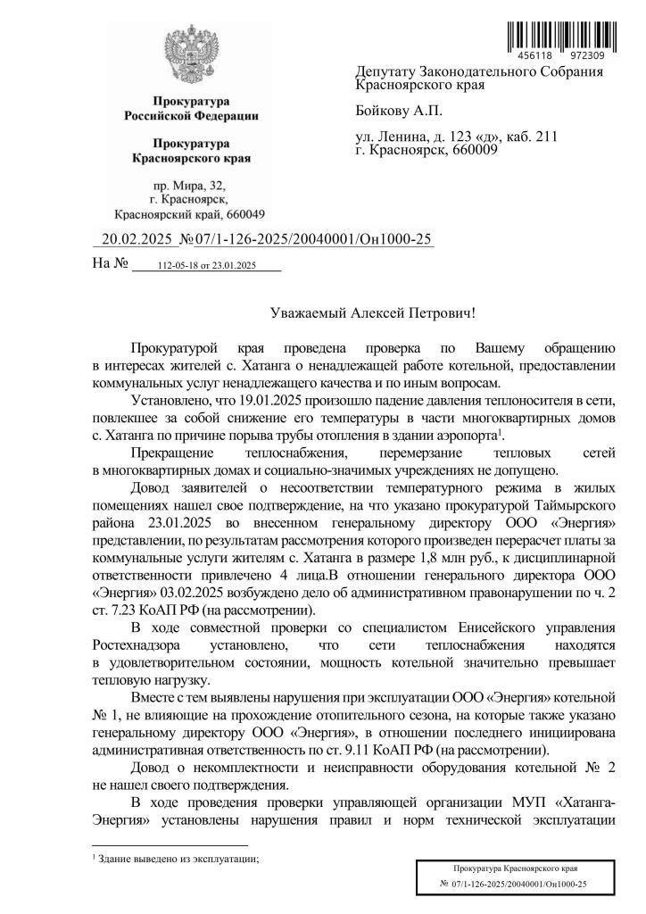 В конце января, когда мороз на севере Красноярского края давил под -50 и ниже, Хатанга осталась почти без тепла: вода в трубах перемерзала, а температура в некоторых домах не превышала четырех градусов. По запросу руководителя фракции ЛДПР в Заксобрании Алексея Бойкова прокуратура провела проверку работы местной котельной. Предсказуемо там нашли нарушения