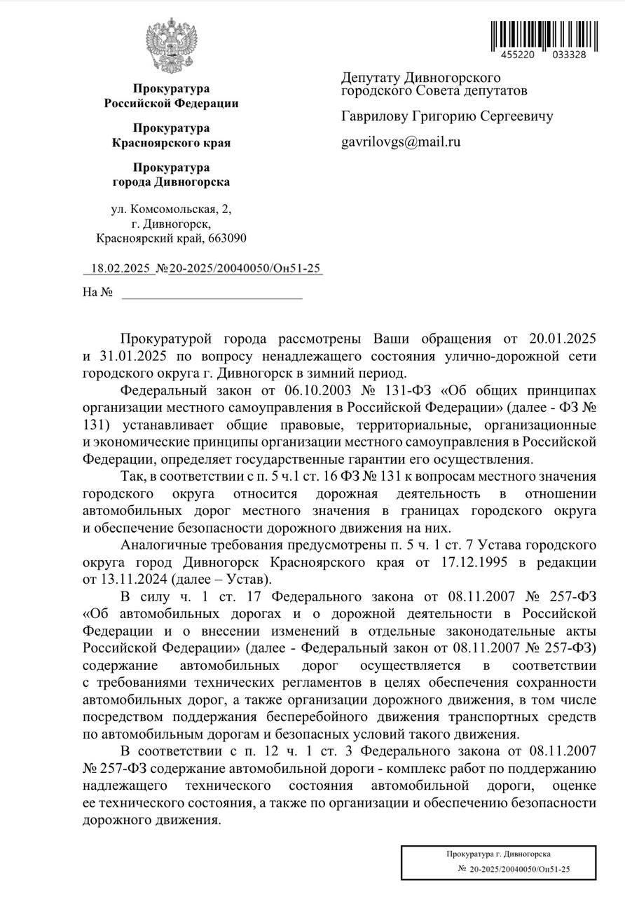 ▪️Прокуратура провела осмотр дивногорских улиц и дорог 13 и 22 февраля и выявила нарушения требований к эксплуатационному состоянию, допустимому по условиям обеспечения безопасности дорожного движения.