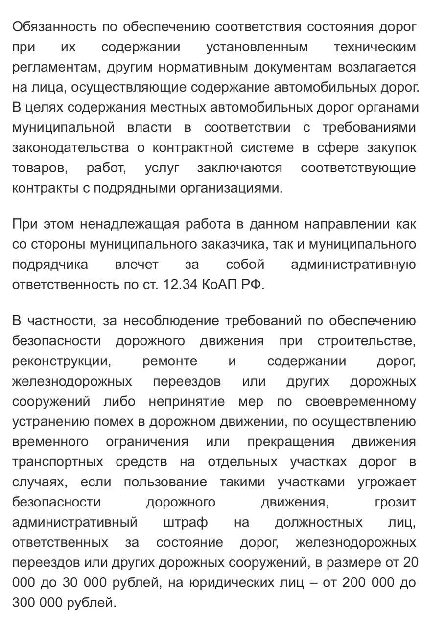 ▪️Директор Управления капитального строительства и городского хозяйства Зоя Коротецкая и директор ООО «Стройсервис» Юрий Власенко получили представления с требованием устранить нарушения федерального законодательства, также им направили уведомления о явке в прокуратуру города для вынесения постановления по делу об административном правонарушении, предусмотренном ч. 1 ст. 12.34 КоАП РФ — несоблюдение требований по обеспечению безопасности дорожного движения при строительстве, реконструкции, ремонте и содержании дорог, железнодорожных переездов или других дорожных сооружений. Влечет наложение штрафа от 200 до 300 тысяч рублей для критических лиц.