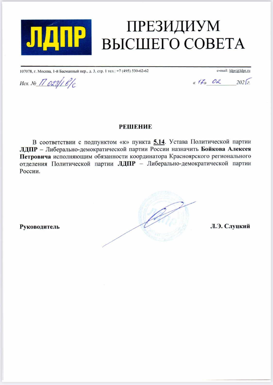 17 февраля 2025 года высший совет ЛДПР принял решение назначить исполняющим обязанности координатора Красноярского регионального отделения ЛДПР Алексея Бойкова