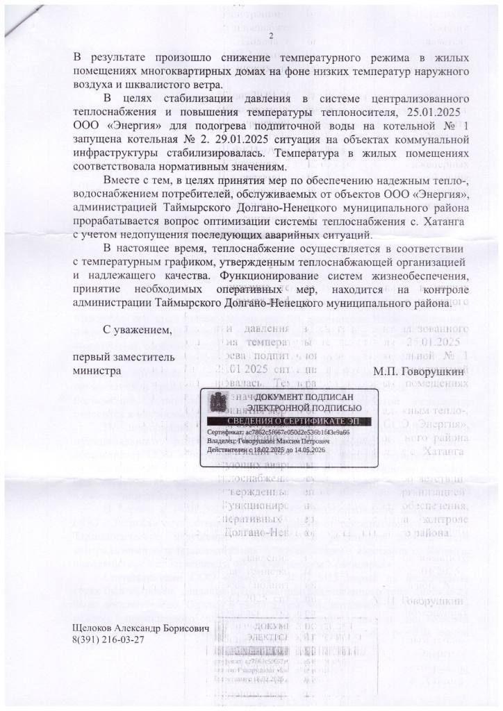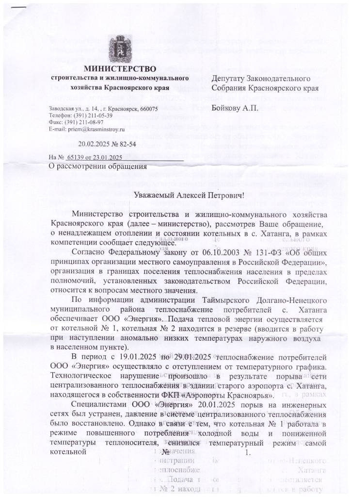 Пришел ответ по ситуации в Хатанге и от профильного министерства. В письме краевой минстрой подтверждает, что на протяжении десяти дней — с 19 по 29 января — теплоснабжение осуществлялось с отступлением температурного графика. И это, напомним, в -50 градусов