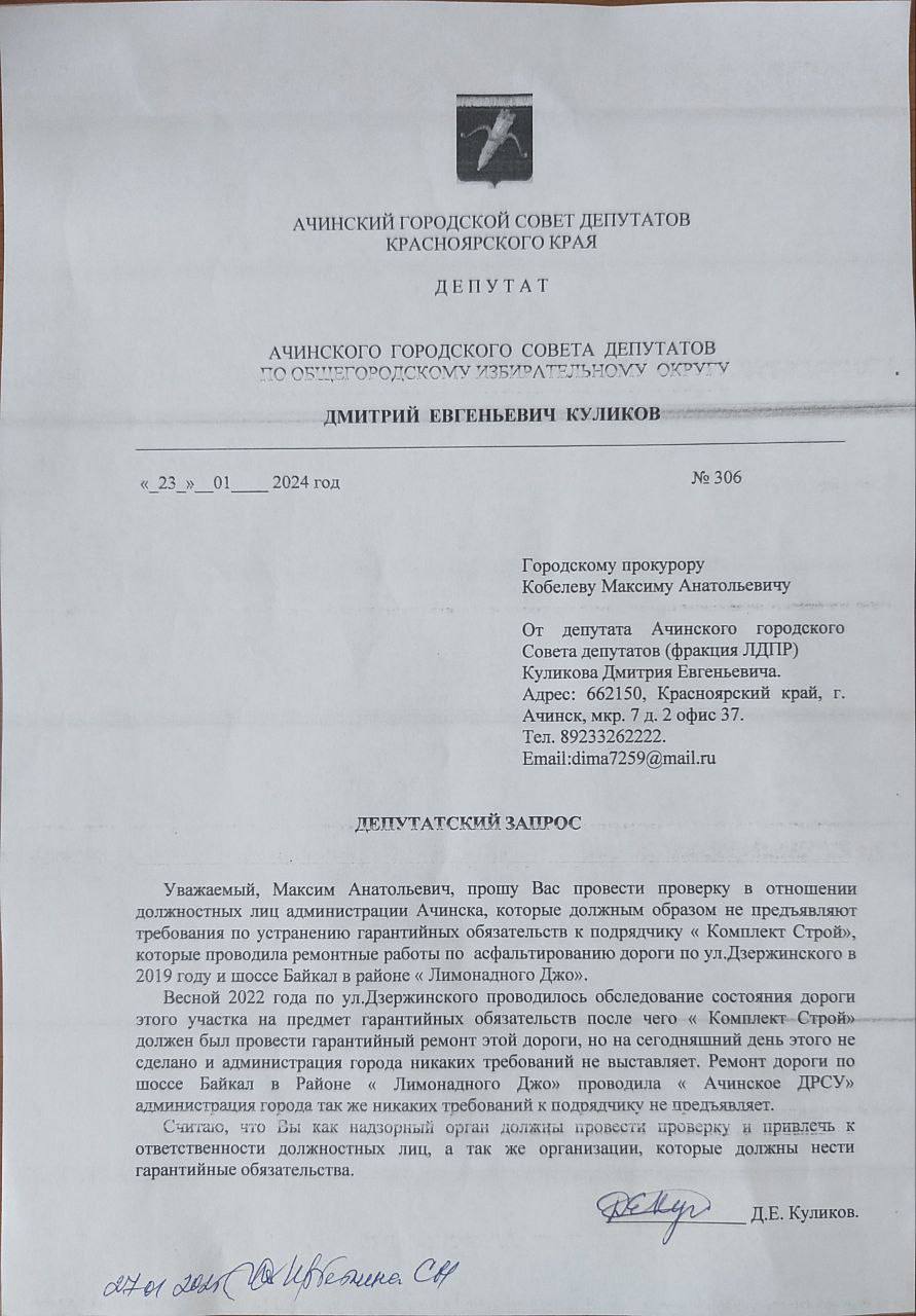 Ещё в 2022 году «Комплекс-Строй» должен был отремонтировать участок улицы Дзержинского от кафе Уют до ПАТП по гарантии, но не сделал этого. А заказчик в лице Центра обеспечения жизнедеятельности Ачинска своевременно не принял мер по судебному понуждению к устранению недостатков в рамках гарантийного срока