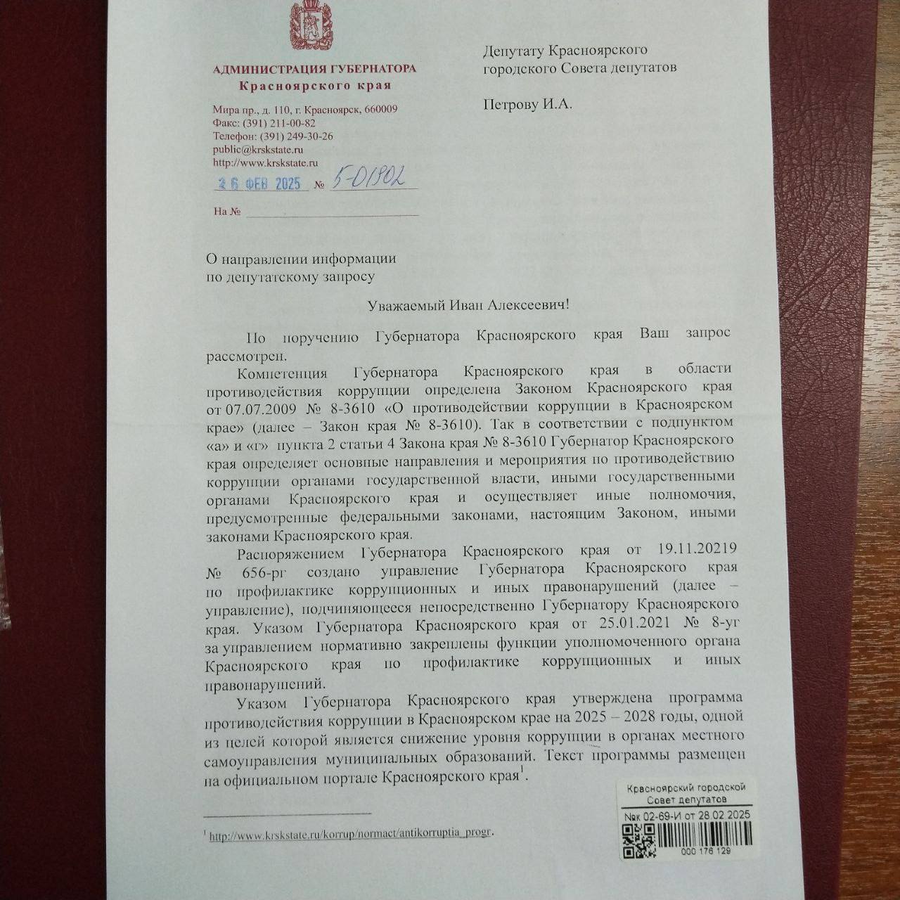 Депутат ЛДПР Иван Петров получил ответ от первого заместителя губернатора. В ответе содержатся ссылки на статьи и указы