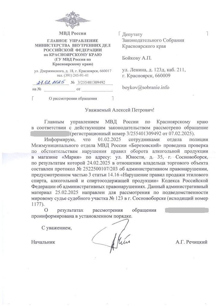 Алексей Бойков обратился по этому поводу в ГУ МВД по краю, на днях получил ответ. После обращения полицейские снова вышли с проверкой и снова составили протокол за нарушение правил продажи алкоголя.