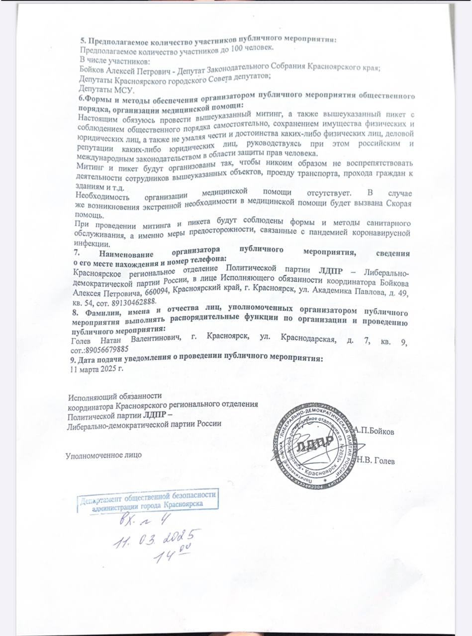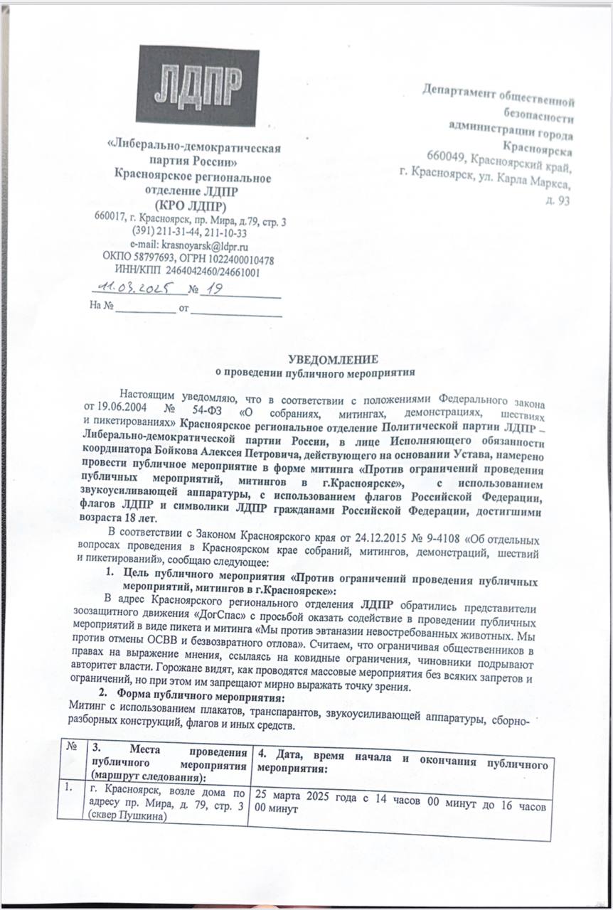 В поддержку общественников ЛДПР направила в администрацию города уведомление с просьбой согласовать проведение митинга 25 марта в сквере «Пушкина». Результатами поделимся.