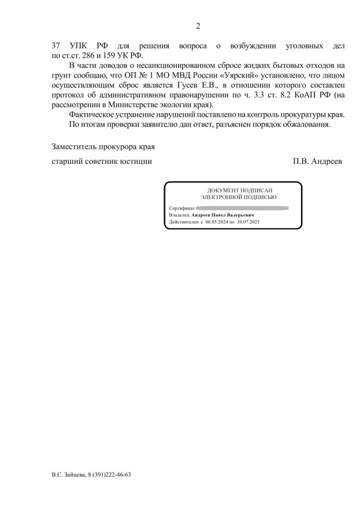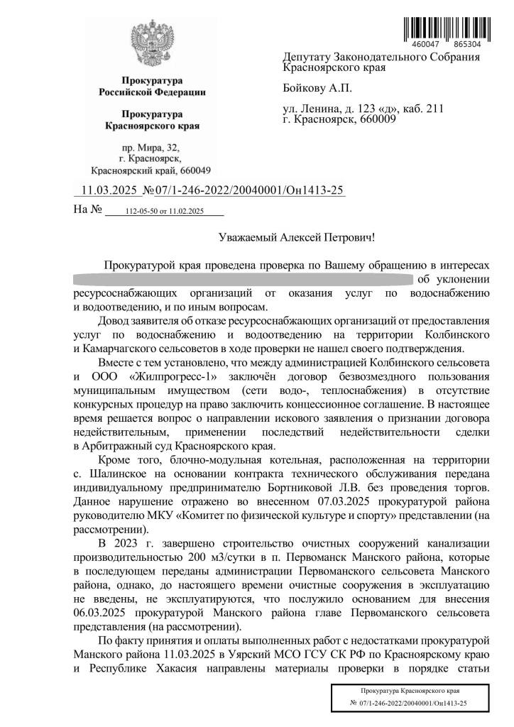 «К сфере ЖКХ в Манском районе накопилось немало вопросов, по следам коллективной жалобы направил обращение уже от своего имени в краевую прокуратуру. Сотрудники ведомства провели комплексную проверку и подтвердили, что в сфере ЖКХ района точно есть, а к чему присмотреться силовикам», — рассказал Алексей Бойков.