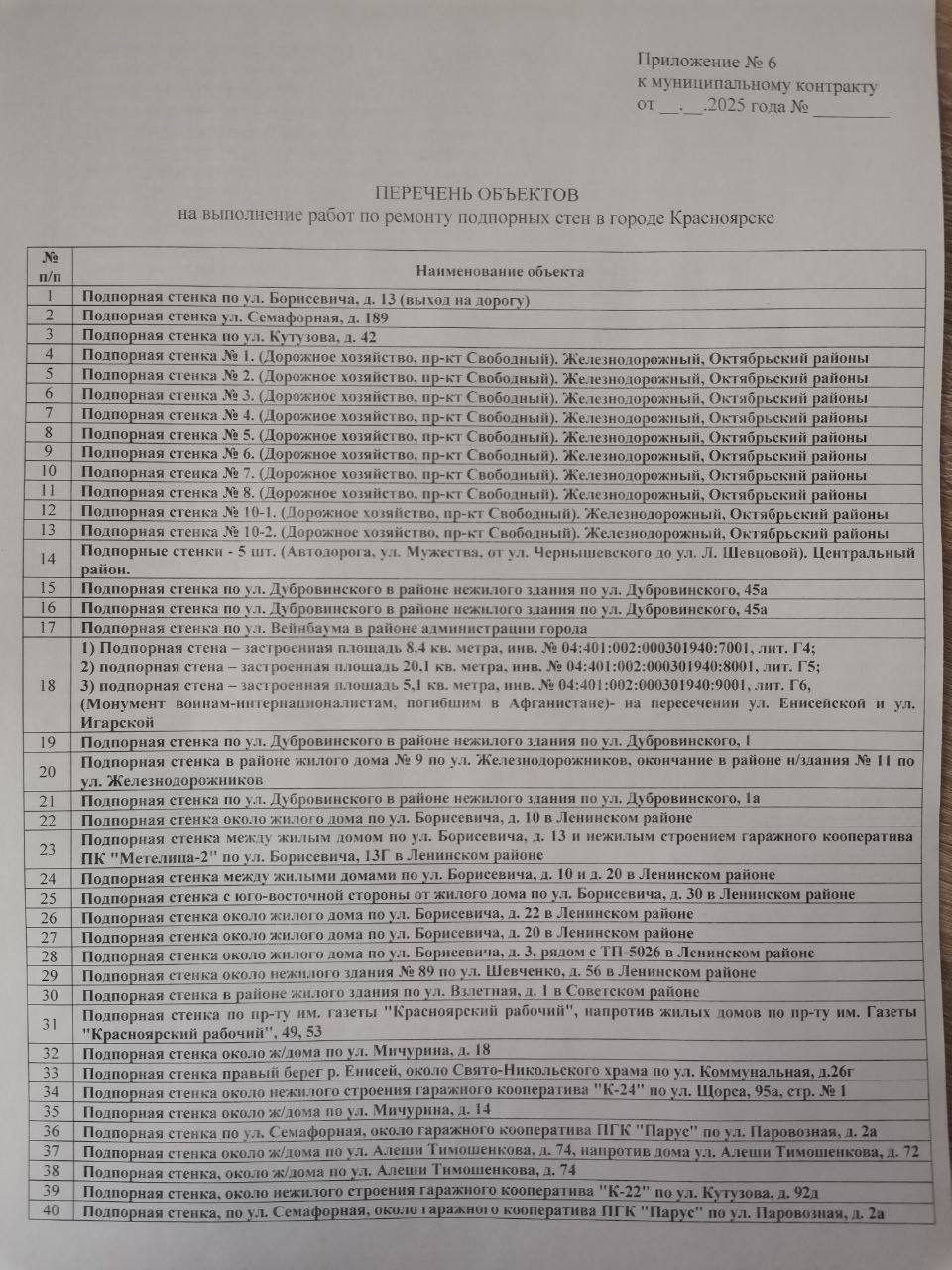 Всего отремонтируют 125 подпорных стен Красноярска. Где и какие, смотрите в прикрепленных документах.