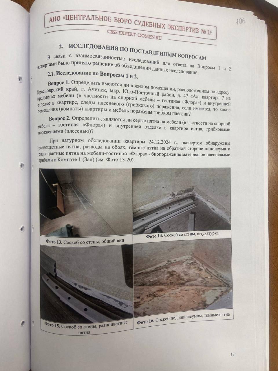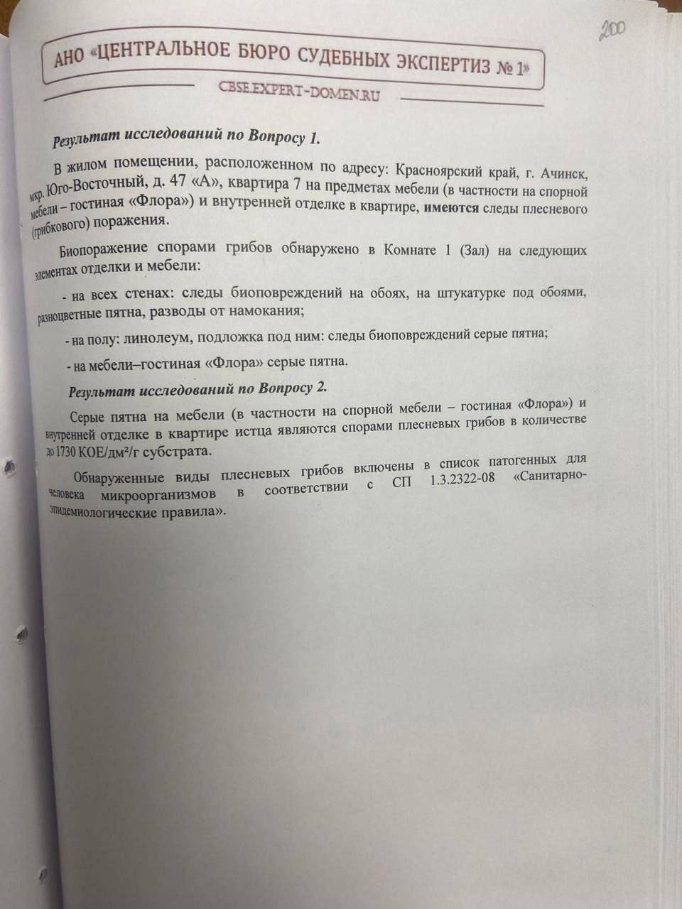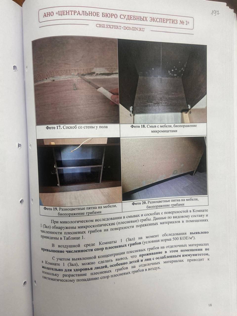Жильцы дома не стали ждать и подали иск в суд о возмещении ущерба за мебель, покрывшуюся плесенью и грибком. Суд назначил экспертизу, за которую собственники помещений заплатили почти 100 тысяч рублей. Ждали результат три месяца, и вот он: на мебели, стенах и полу обнаружили грибок, который угрожает здоровью.