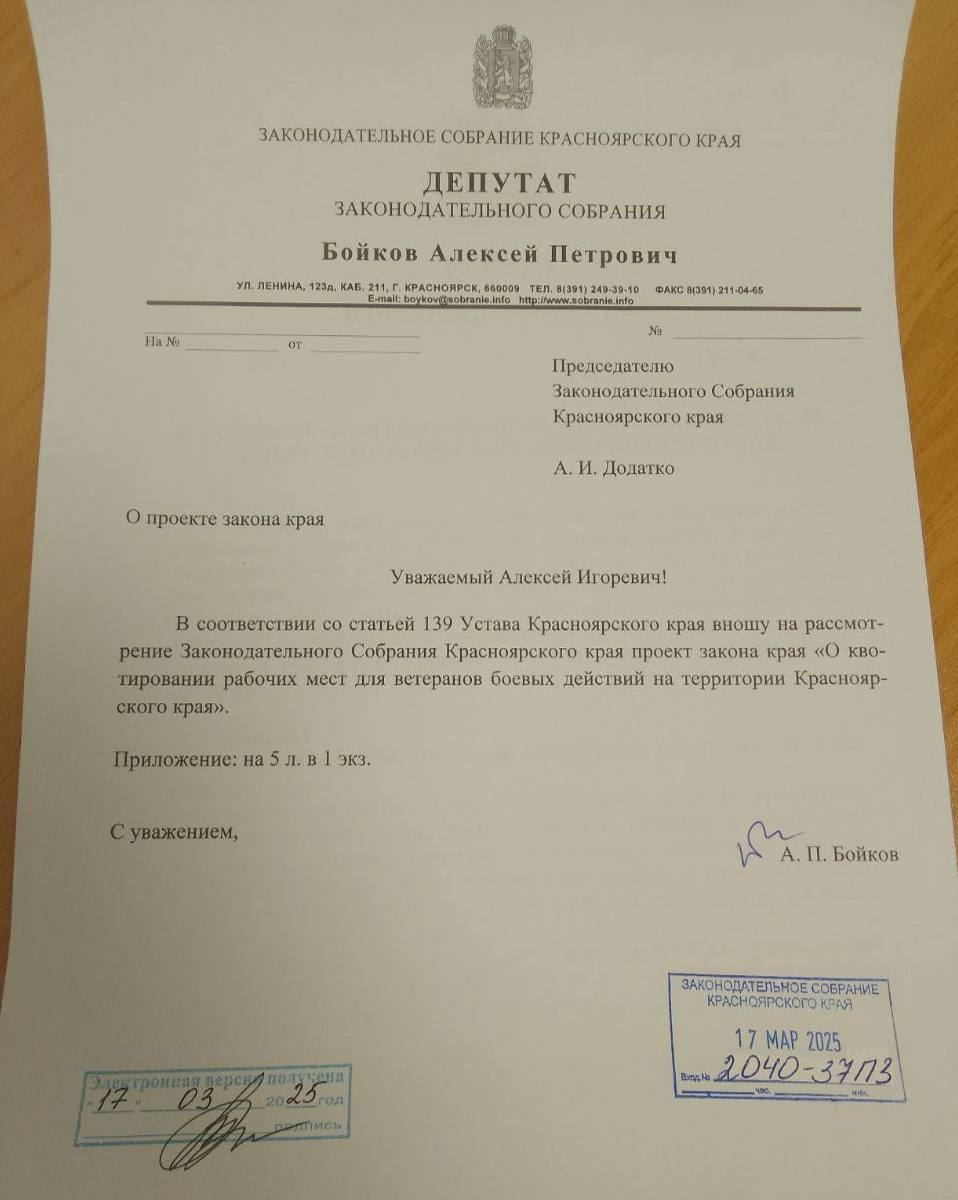 Руководитель фракции ЛДПР в Законодательном собрании края Алексей Бойков внес проект закона «О квотировании рабочих мест для ветеранов боевых действий на территории Красноярского края». Его главная цель — гарантии занятости для ветеранов боевых действий