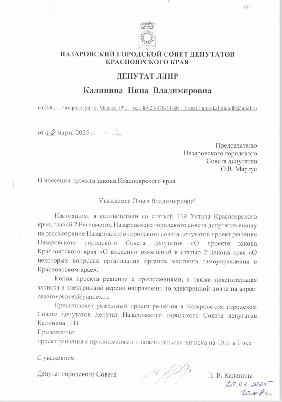 Депутат ЛДПР Нина Калинина направила в Назаровский городской совет законопроект, предполагающий возвращение прямых выборов главы. Народная избранница убеждена, выбирать главу города и оценивать его работу должны люди, а не комиссия, состоящая наполовину из краевых чиновников, которые в Назарово скорее всего не бывают даже проездом, наполовину — из депутатов горсовета, как правило, партии большинства. Такой расклад, по сути, выбора не оставляет. Очевидно, пройдет нужный человек.