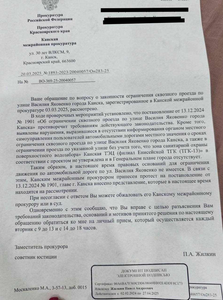 ▪️Постановление от 13 декабря 2024 года «Об ограничении сквозного проезда по улице Василия Яковенко города Канска», подписанное главой Канска Ольгой Витман, противоречит требованиям действующего законодательства