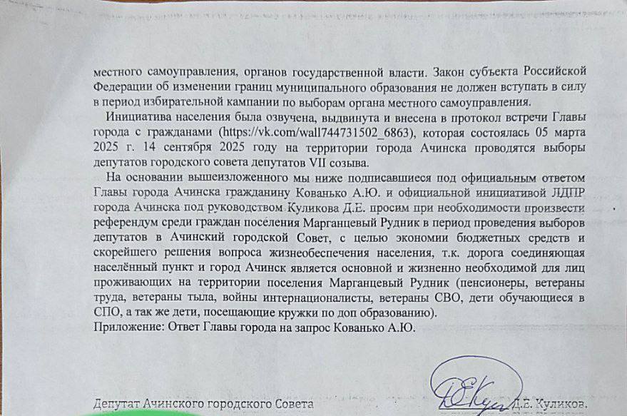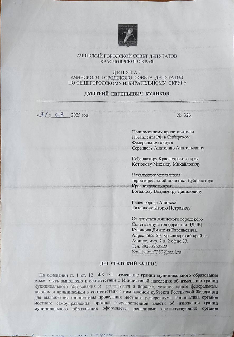 Депутаты ЛДПР вместе с жителями посёлка отправили обращение с подписями местных жителей Полпреду президента РФ в Сибирском федеральном округе, Губернатору Красноярского края, начальнику управления территориальной политики губернатора Красноярского края и главе Ачинска.