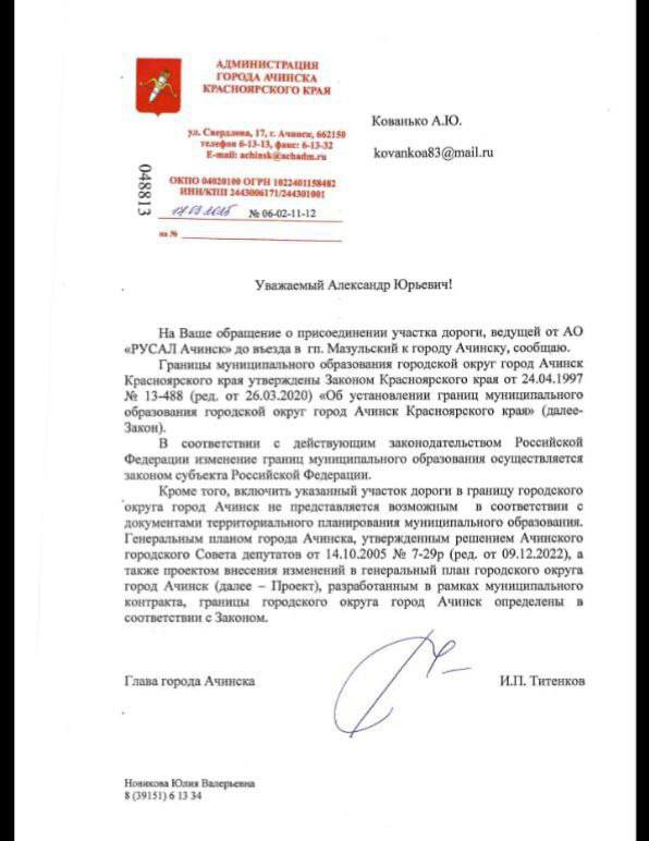 После запросов в администрацию города депутат ЛДПР Дмитрий Куликов получил ответ, что участок дороги принадлежит не городу, а району. Ранее жители и сам посёлок относились к Ачинскому району, и обслуживание дороги находилось на балансе района. Только после присоединения посёлка к городу вопрос о состоянии дороги остался без внимания.