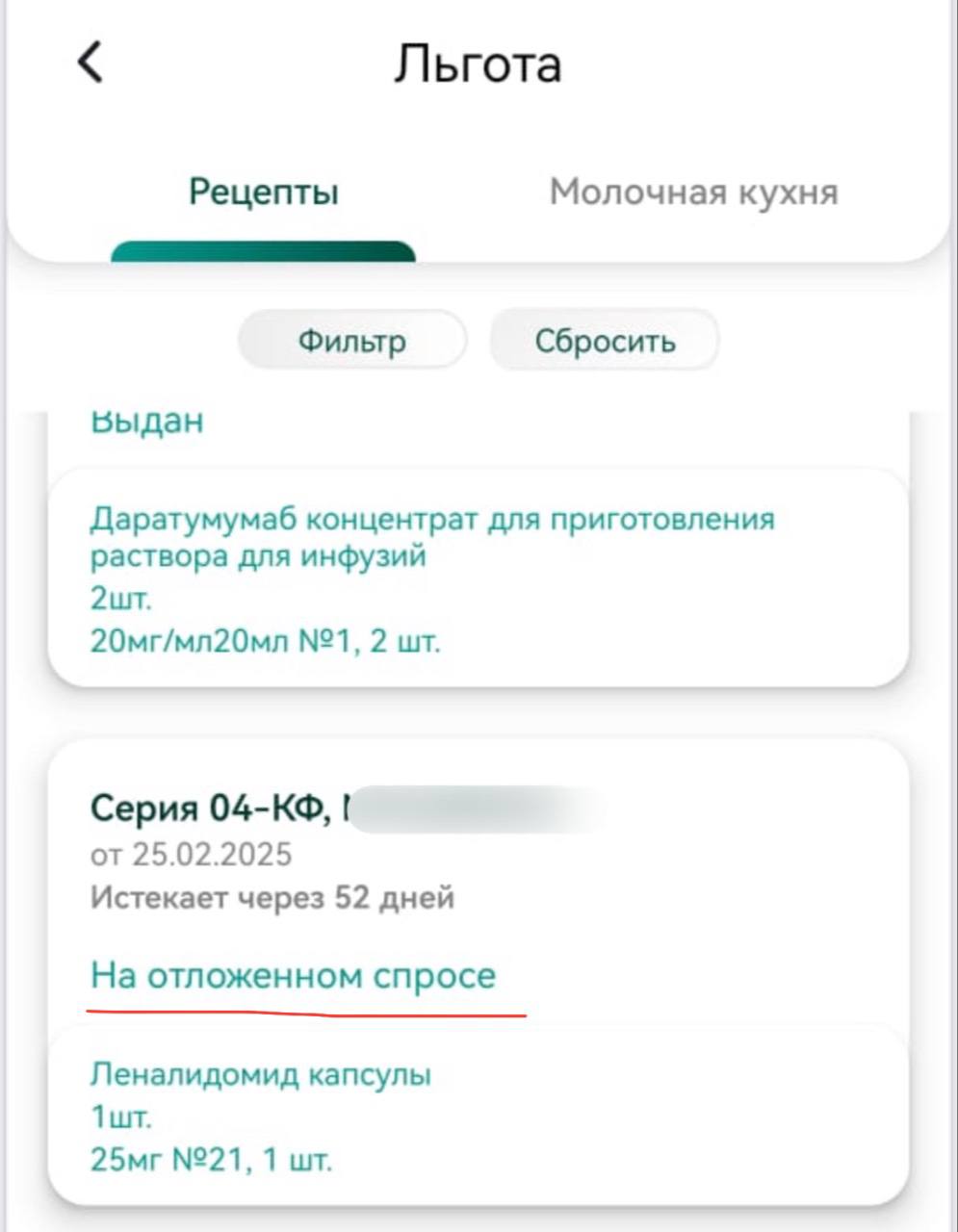«21 января выдали одну упаковку Леналидомида. Сразу начали курс, так как пропуск без жизненно важной поддержки получился два месяца: декабрь, январь. 23 января я подала документы на следующий рецепт, но его аннулировали без выдачи препарата. Я лично ежемесячно хожу в рецептурный кабинет с выпиской для нового рецепта после каждой ежемесячной госпитализации для выписки нового рецепта. Так как от 23 января рецепт на Леналидомид опять аннулировали через месяц, я 25 февраля подала на новый рецепт. Уже апрель, а препарат на февраль и март нам так и не выдали».