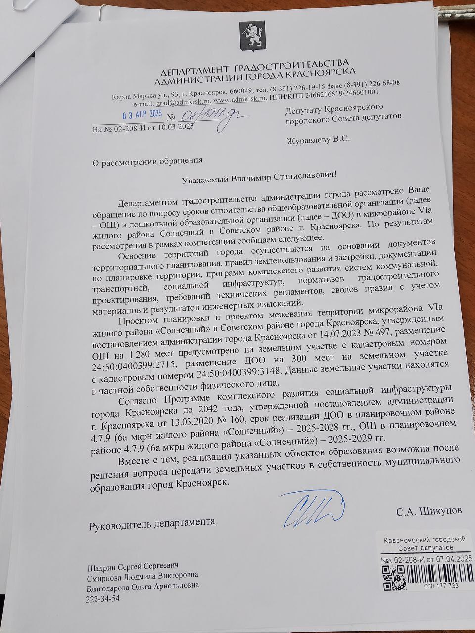 «Руководитель градостроительства на мой вопрос о сроках возведения социальных объектов пояснил, что в настоящее время порядка изъятия из частной собственности земельных участков под строительство не существует. Соответственно, никаких гарантий, что обещанные школа и детский сад появятся в обозначенном месте, нет», — подвел итог Владимир Журавлев.