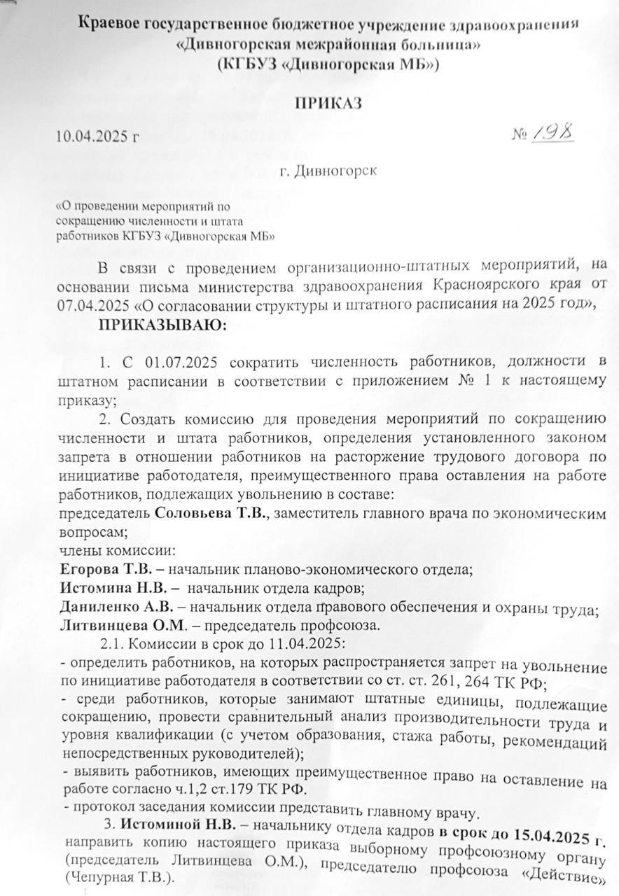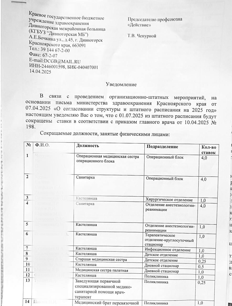 В Дивногорской больнице началась зачистка кадров: 10 апреля 2025 года главный врач подписал приказ о сокращении 43 сотрудников. Хотя ещё 20 февраля в медицинском учреждении официально отрицали слухи об увольнениях. Депутат ЛДПР Григорий Гаврилов раскритиковал такую «оптимизацию»