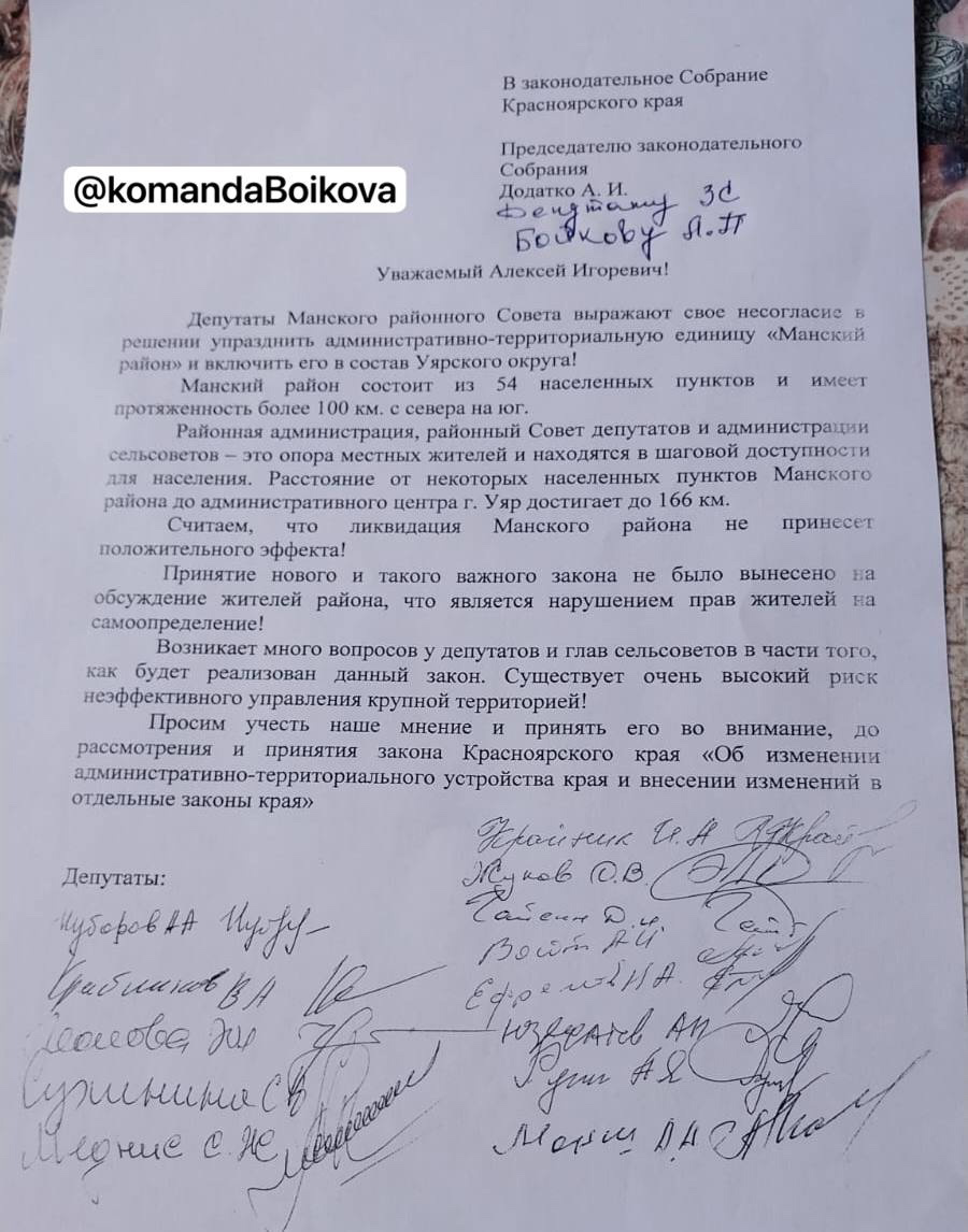 Парламентарий тем временем продолжает получать негативные «рецензии» на муниципальную реформу. Очередное обращение поступило от группы депутатов Манского района. Его подписало большинство народных избранников ВСЕХ фракций. Редкий случай единения всех партий. Люди выражают несогласие с присоединением Манского района к Уярскому.