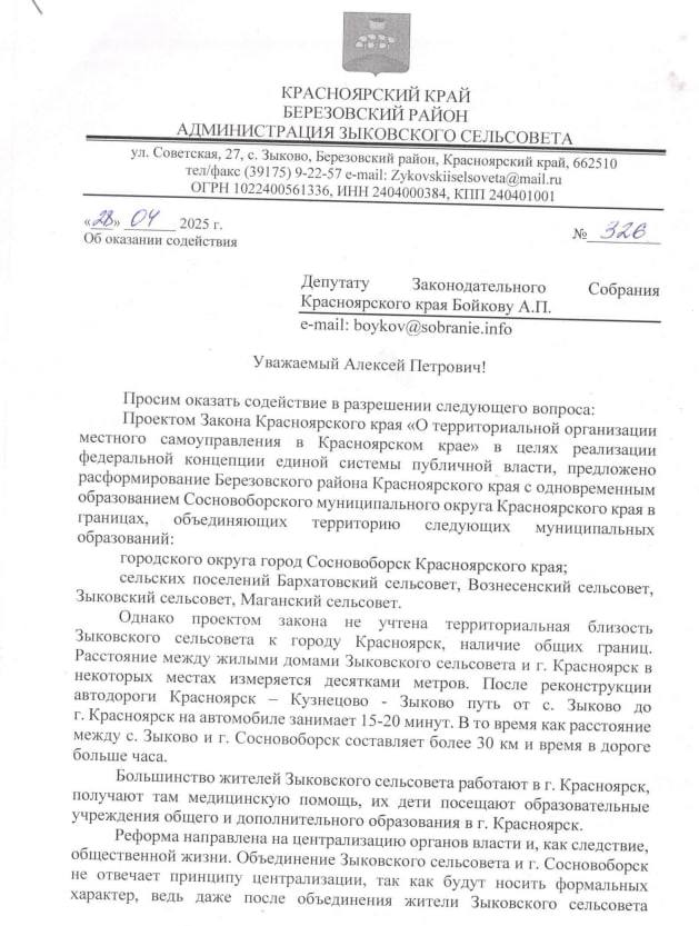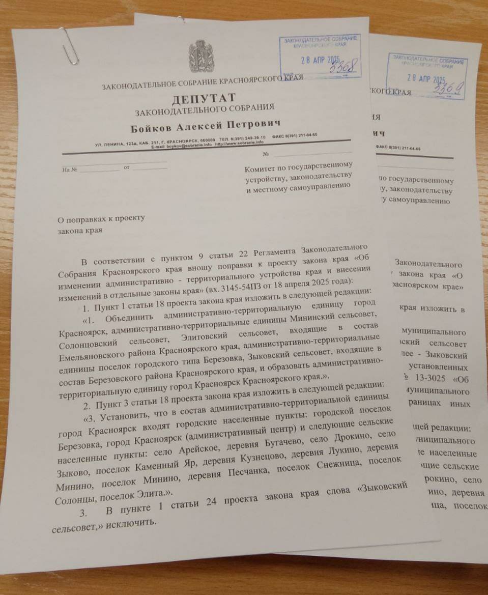Руководитель фракции ЛДПР в Заксобрании края Алексей Бойков внес соответствующую поправку к законам края о проведении муниципальной реформы. Сделал он это, опираясь на сообщения жителей перечисленных населенных пунктов, мнения депутатского корпуса Зыковского сельсовета, а также официальную просьбу администрации Зыковского сельсовета
