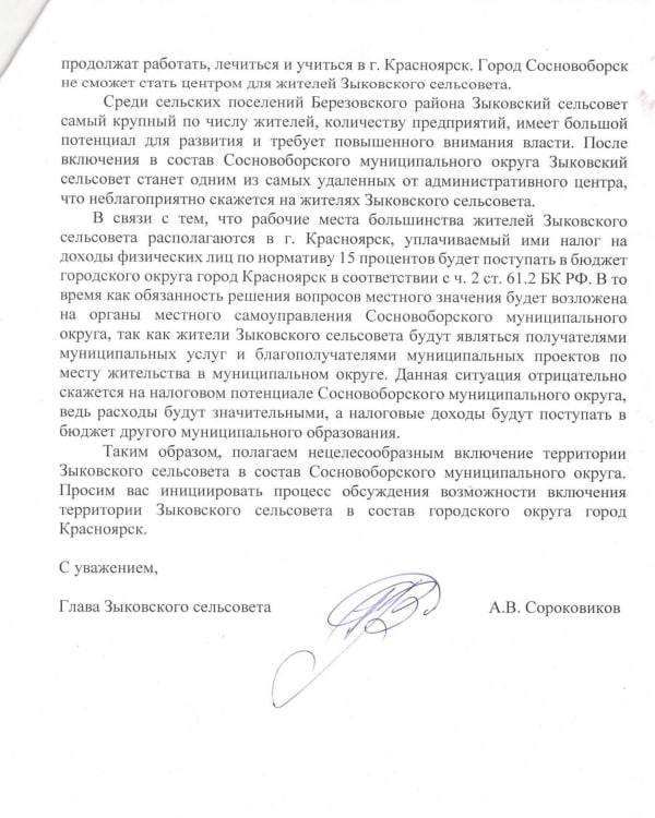«Граница между Красноярском и этими правобережными деревнями весьма условна. Ежедневно тысячи их жителей ездят на работу в Красноярск, пользуясь городскими учреждениями. Ездят туда люди по новой, современной трассе, реконструкции которой в ЛДПР добивались несколько лет. Многие школьники Зыково, Лукино и Кузнецово прикреплены к красноярским образовательным учреждениям. Прописаны некоторые тоже там. Включение этих населенных пунктов в Сосновоборский муниципальный округ — неудобно буквально всем. На левом берегу к краевой столице присоединяют Солонцы, а также гораздо более отдаленные Арейское и Снежницу, что мешает тому же на правом берегу? Логики не прослеживаю», — делится Алексей Бойков.