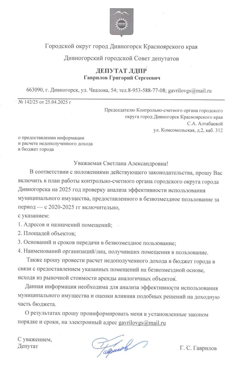 Депутат ЛДПР в Дивногорске Григорий Гаврилов предложил проконтролировать эффективность использования городского имущества. Народный избранник направил в контрольно-счётный орган Дивногорска предложение включить в план работы на 2025 год важную проверку