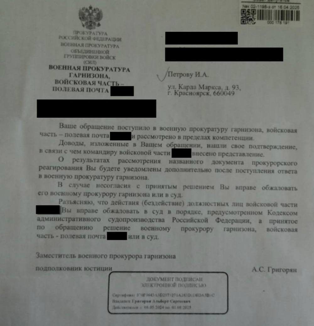Некоторое время назад депутат получил ответ, где сказано, что факты, изложенные в ю запросах нашли подтверждение. В связи с этим командиру войсковой части, куда прикомандировали военнослужащих, внесли представление. Делом занялась прокуратура гарнизона.