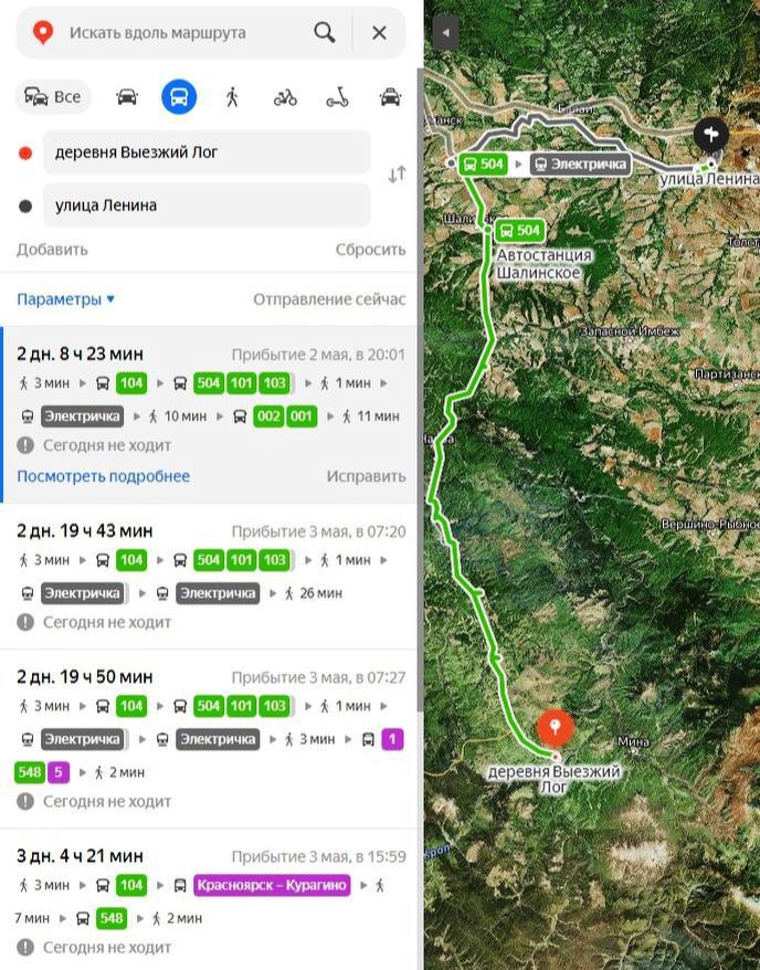 «Более того, межмуниципальных маршрутов, соединяющих Манский район с Уяром, сейчас попросту нет. Специально проверил на себе, вбив нужные точки в навигатор. Если у вас нет личного авто, то из Выезжего Лога до Уяра на общественном транспорте можно добраться за «каких-то» три дня. Как вам? Удобно? Быстро? Похоже на «оптимизацию» и «улучшение качества жизни»?», — подчеркивает Алексей Бойков.