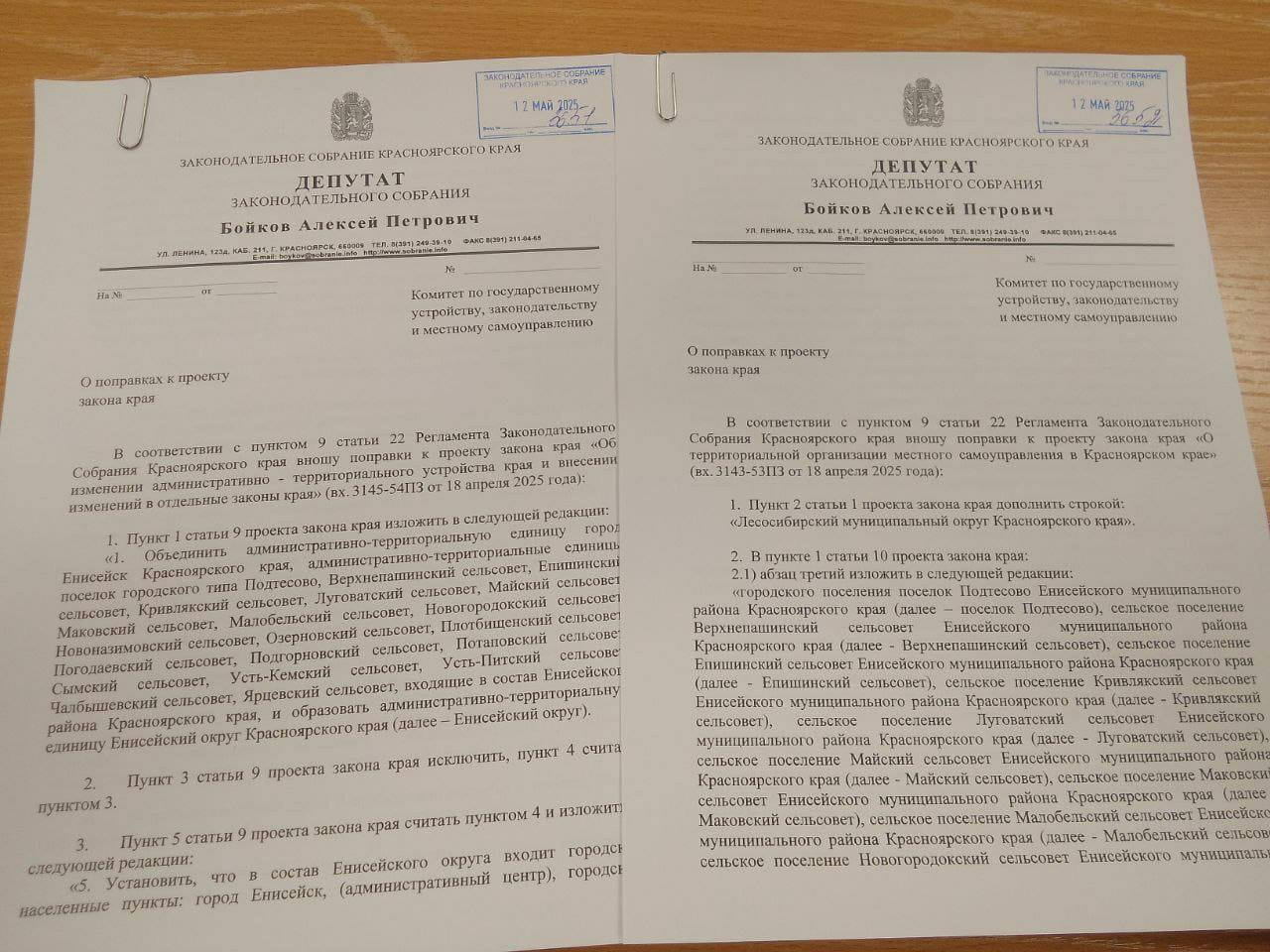 «Убежден, что это ошибка в муниципальной реформе, которую нужно устранить. Сегодня я внес пакет поправок, сохраняющий самостоятельность Енисейского района. Согласно предлагаемым мной изменениям, Енисейск должен сохранить собственную администрацию. Вместе с тем сельсоветы Енисейского района, которые ближе к Лесосибирску, прошу присоединить к нему. Ведь намного логичнее, например, из села Абалаково доехать 19 километров до новой администрации и городской больницы, чем 65 километров до Енисейска», — заявил Алексей Бойков.