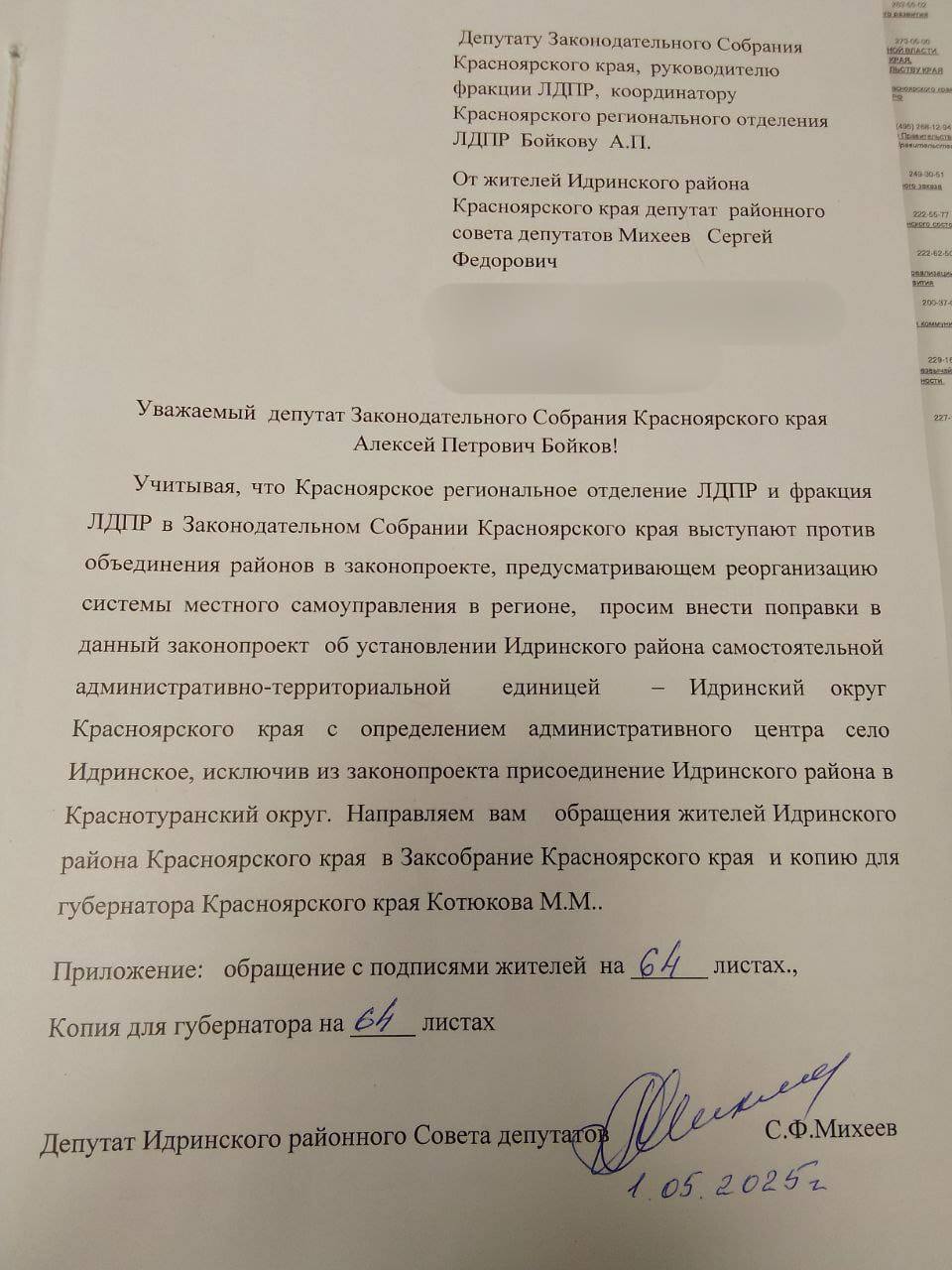 Парламентарий получил коллективные обращения от жителей Нижнеингашского района, Идринского района и Пировского муниципального округа. Люди в этих территориях не хотят объединяться с другими, а желают сохранить собственные районы и округа. Люди тысячами подписываются против будущей муниципальной реформы, подчеркивая, что законопроект в нынешнем виде резко отдалит власть от народа и повлечет за собой ухудшение жизни. Как тут можно делать вид, что ничего не происходит?