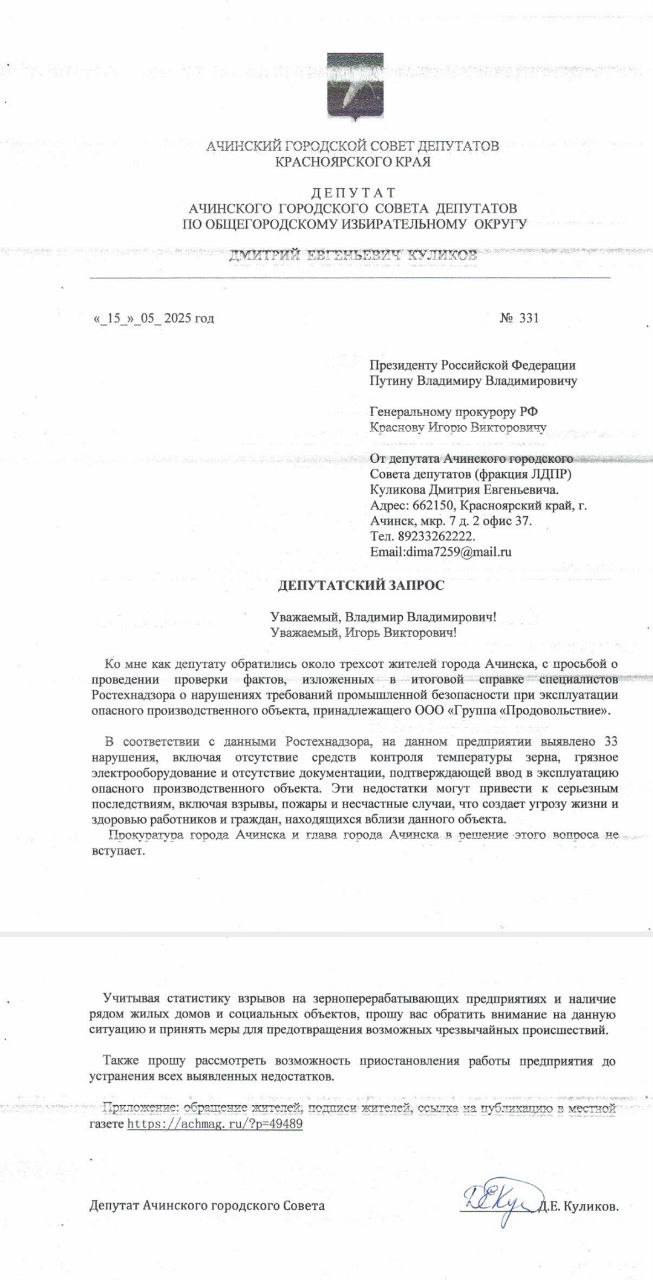 Недавняя проверка Ростехнадзора выявила серьезные нарушения на мелькомбинате в Ачинске, которые ставят под угрозу жизнь не только работников, но и горожан. О ситуации в социальных сетях сообщил депутат Ачинского горсовета от ЛДПР Дмитрий Куликов