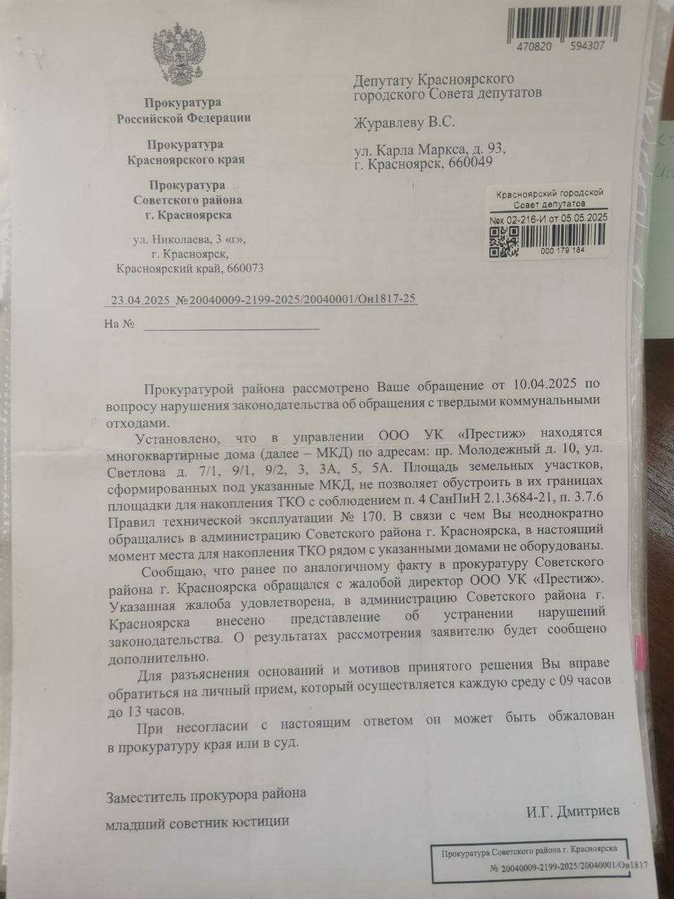 Прокуратура Советского района на запрос депутата ЛДПР Владимира Журавлева о нарушении законодательства об обращении с твердыми коммунальными отходами по указанным адресам провела проверку. В результате администрация Советского района получила представление об устранении нарушений законодательства.