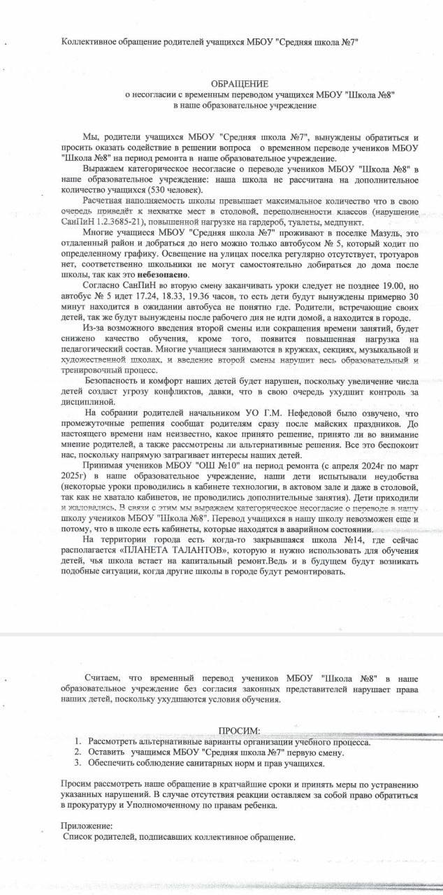 2. Нарушение норм и правил: Родители уверены, что такое решение противоречит всем нормам и правилам, касающимся образовательного процесса. Они выбирали школу № 7 именно потому, что здесь обучение проходит только в первую смену.