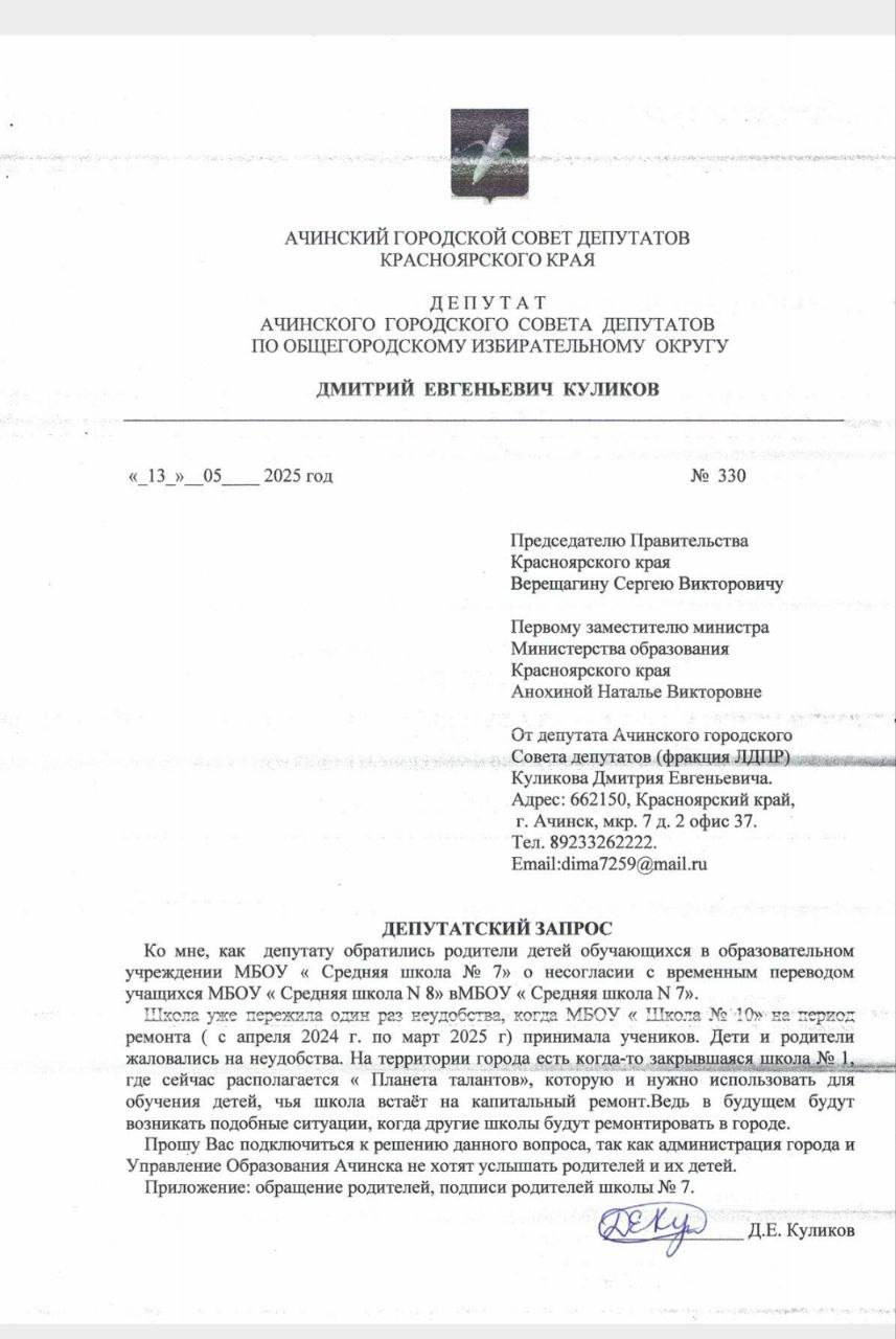 Дмитрий Куликов, получивший обращение от родителей, сделал запросы Председателю правительства Красноярского края и заместителю образования Красноярского края. Ждем ответа.