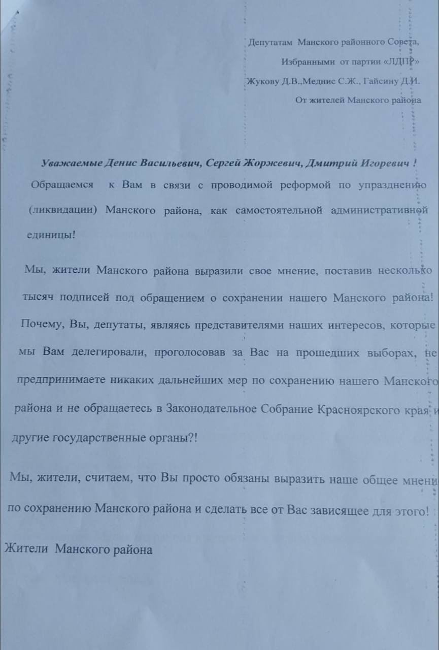 Депутаты Манского районного совета от ЛДПР Денис Жуков, Сергей Меднис и Дмитрий Гайсин получили коллективное обращение от жителей, не согласных с проводимой реформой и ликвидацией их родного района как самостоятельной административно-территориальной единицы. Под инициативой о сохранении Манского района подписалось несколько тысяч человек