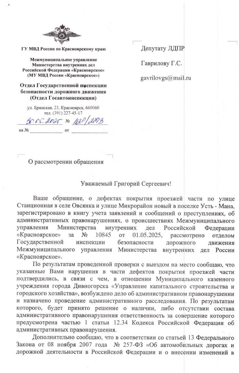 По обращению депутата ЛДПР Григория Гаврилова о ненадлежащем состоянии дорожного покрытия на улицах Станционная в Овсянке и Микрорайон Новый Усть-Мане, ГИБДД провела выездную проверку