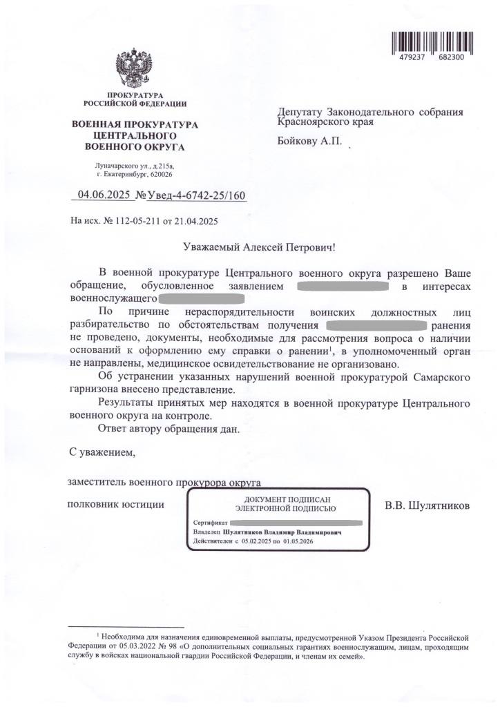В официальном ответе на запрос парламентария ведомство указывает, что причиной сложившейся ситуации стала «нераспорядительность воинских должностных лиц». До сих пор не выяснили обстоятельства получения ранения, медицинского освидетельствования не было, справки о ранении нет. Самарскому гарнизону уже вынесли представление.