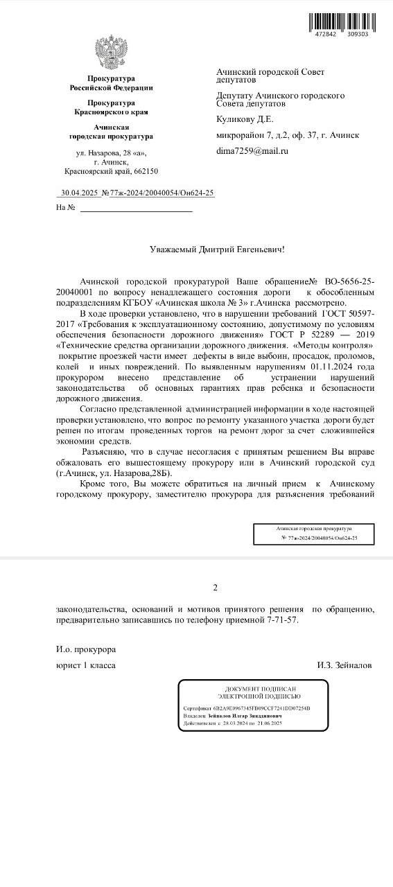 Ответ прокуратуры обнадёжил: администрация города сообщила, что ремонт улицы Манкевича проведут за счёт экономии средств, оставшихся после ремонта других дорог в Ачинске. Казалось бы, победа. Вопрос поставили на контроль, и наконец-то дорогу приведут в порядок. Но не тут-то было.