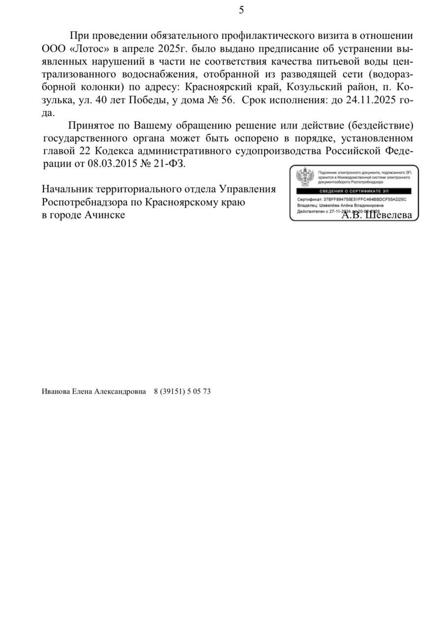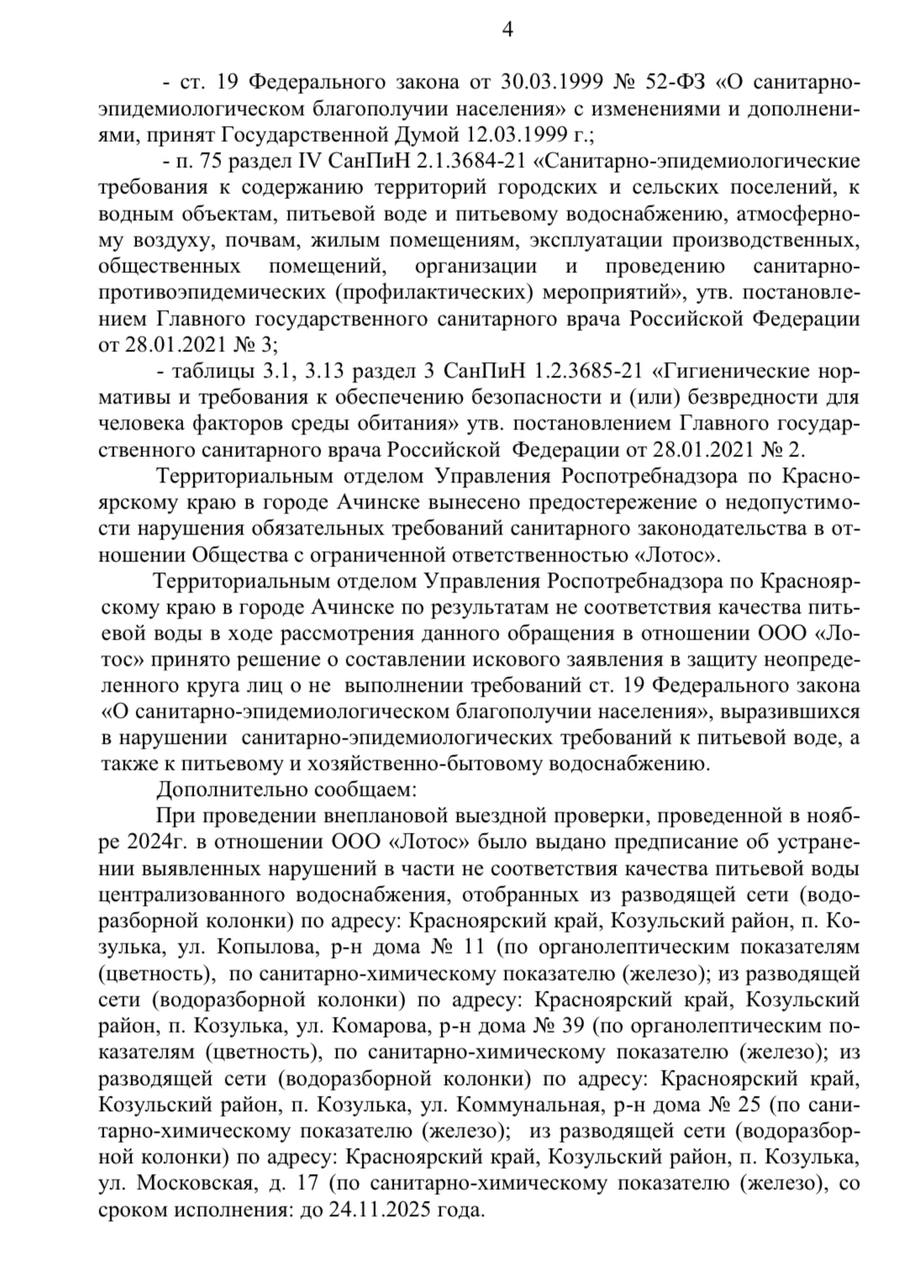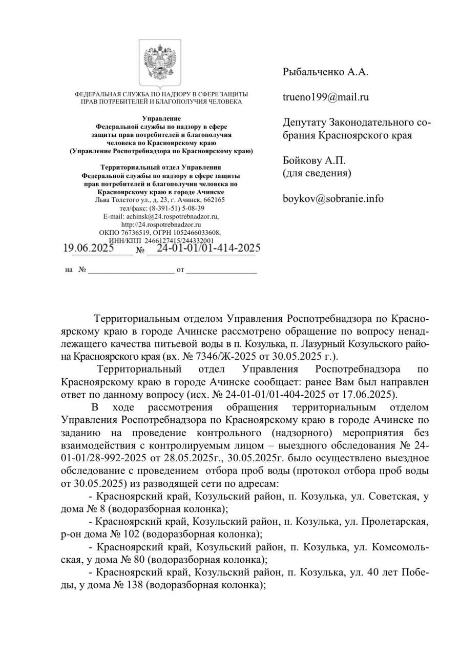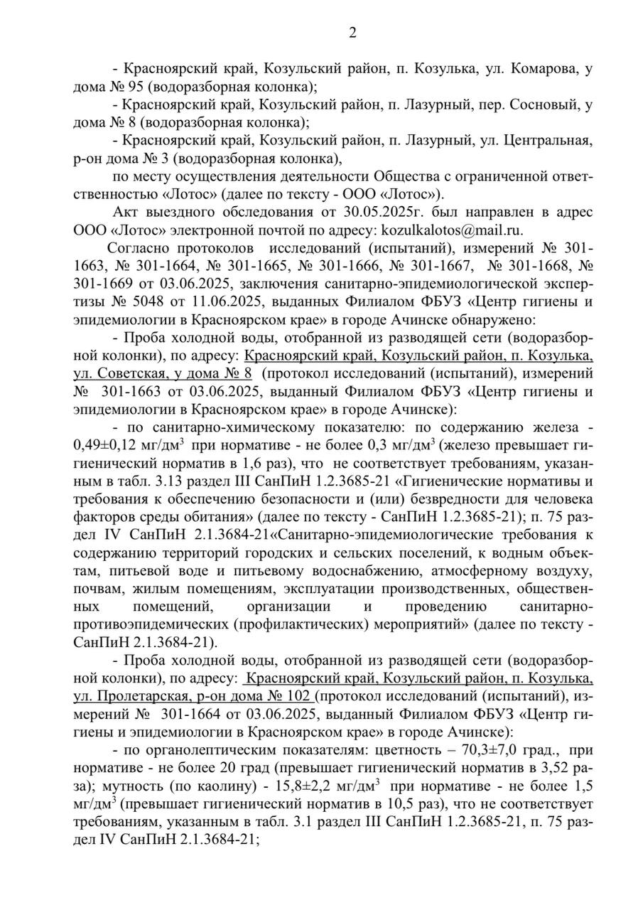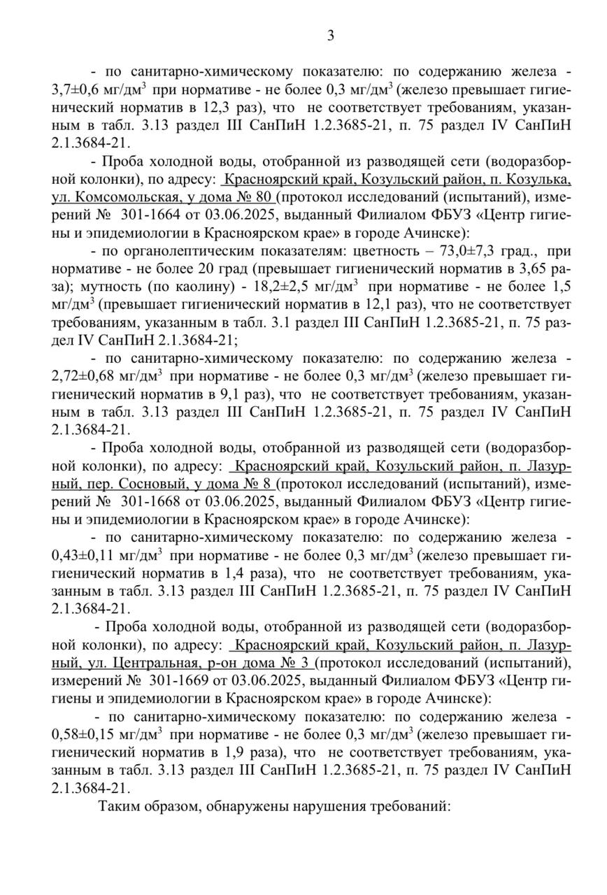 То, что с водой что-то не так, видно даже невооруженным взглядом. Опасения людей подтвердил и Роспотребнадзор. В ответ на запрос Алексея Бойкова по ситуации в ведомстве сообщили, что провели выездное обследование и отбор проб воды в семи колонках в Козульке и Лазурном. Итог: нарушения есть во всех образцах! Где-то превышены гигиенические нормативы содержания железа, где-то вода не прошла по цветности и мутности. В некоторых случаях нормативы превышены в 12 раз. Это ПИТЬЕВАЯ вода в районном центре с населением почти в 7000 человек! Как это вообще возможно? Роспотребнадзор по этой проблеме теперь выходит в суд.